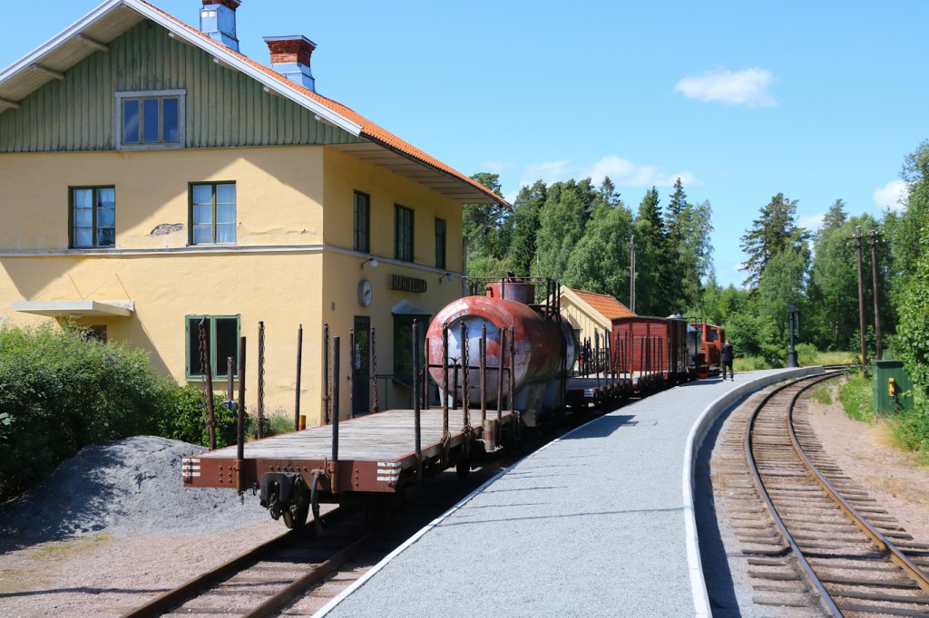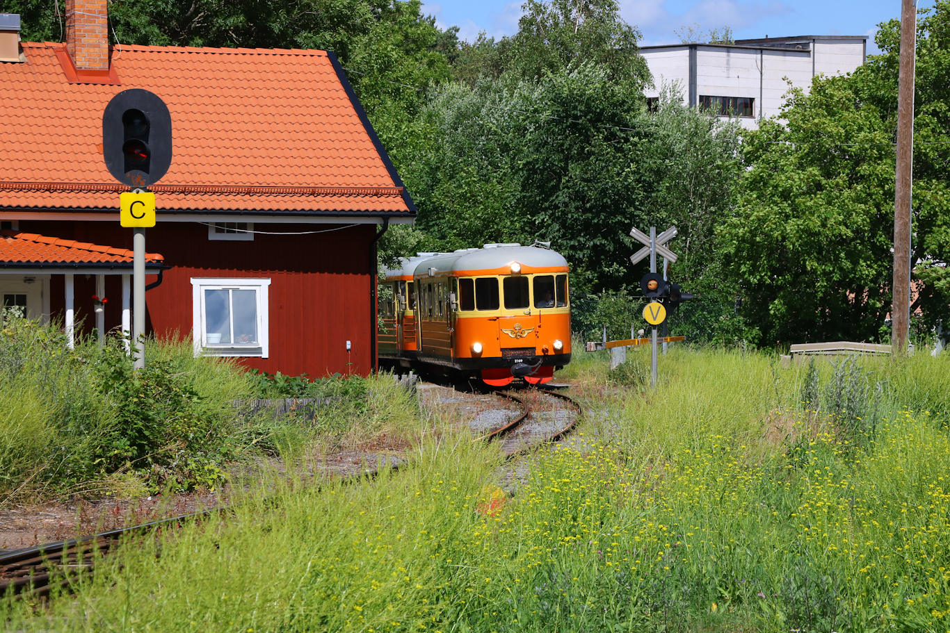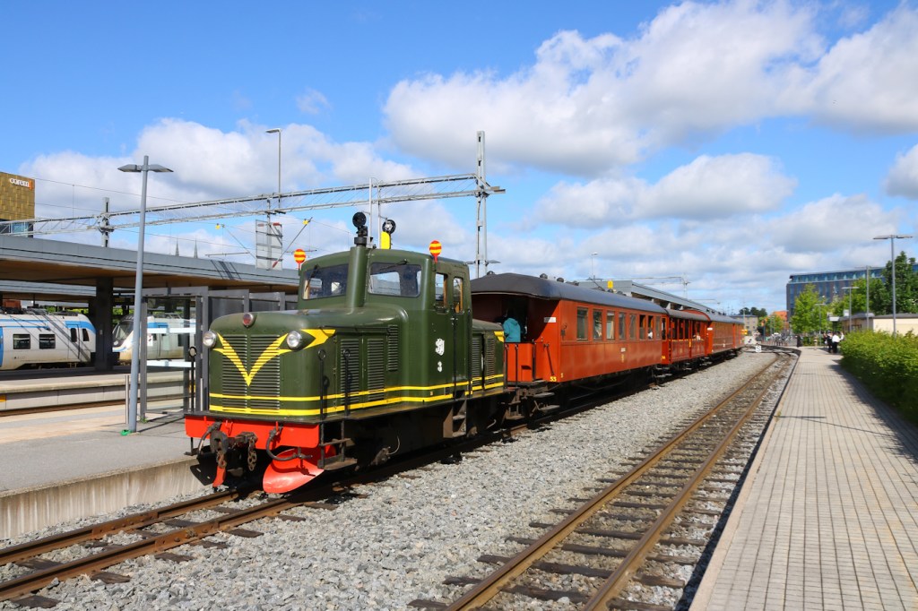 Dieselloket växlade om för tur in mot Uppsala efter en halvtimmes uppehåll. Stationshuset till höger ser kanske gammalt ut, men är byggt så sent som 2011 efter att det gamla stationshuset brann ner i början av 1980-talet. Utseendet är förstås hämtat från det ursprungliga stationshuset.