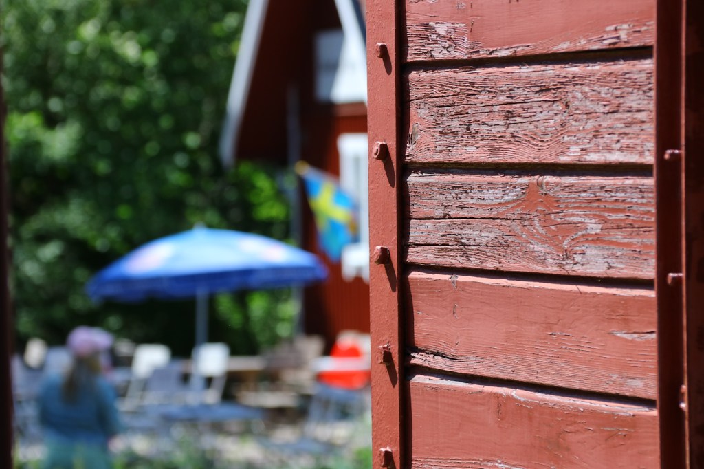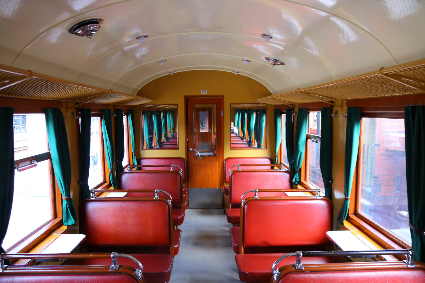 Godsvagnsdetaljer i förgrund och trivsam servering i bakgrund.