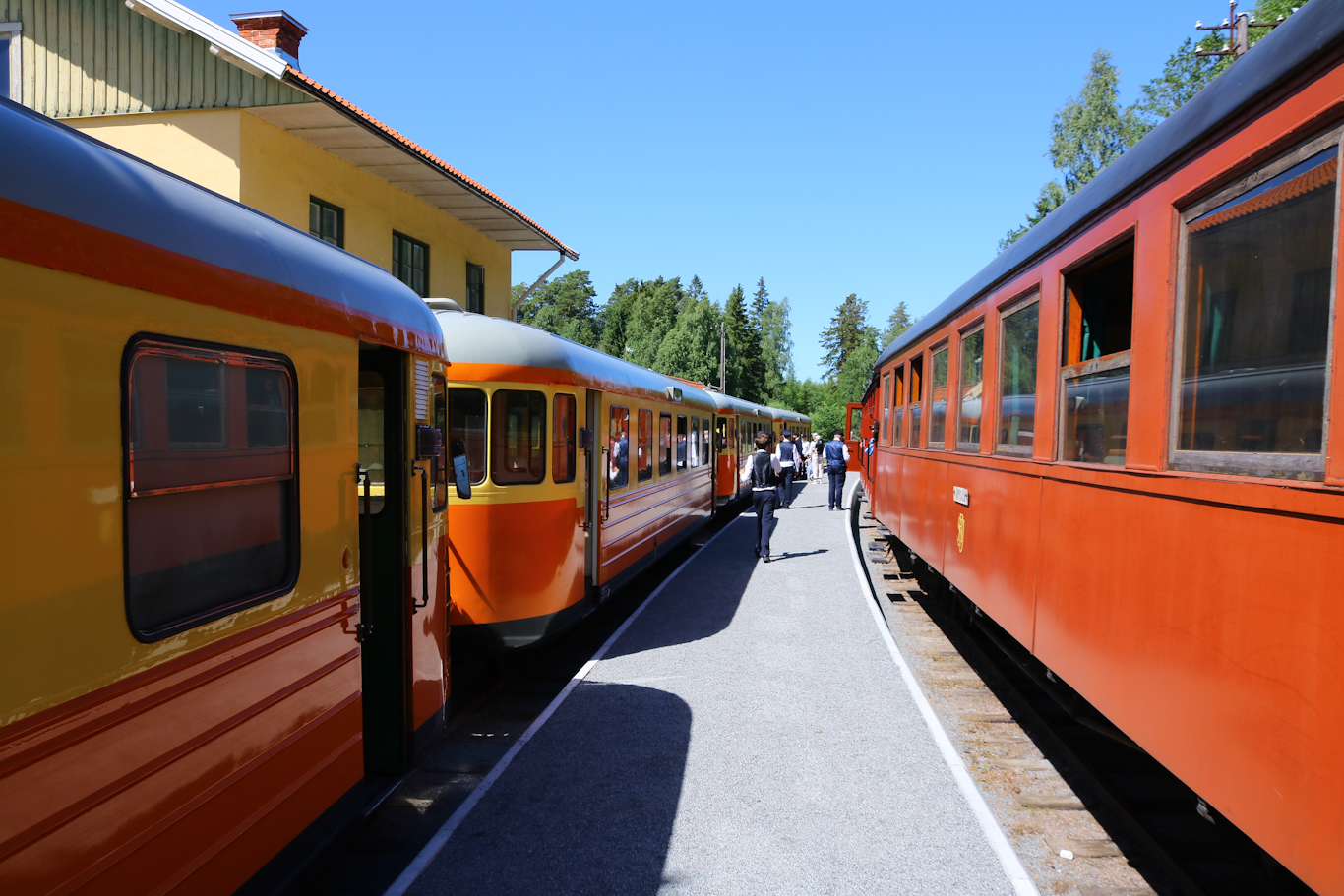 Tillbaka i Selknä igen här där vi väntade in utgående tåg mot Faringe. Dieseltåget gick mot Uppsala Östra. Den nyrenoverade sommarvagnen var populär att resa med förstås. Tågpersonalen stiligt klädda! (Konduktörer, biljettgranskare m m)