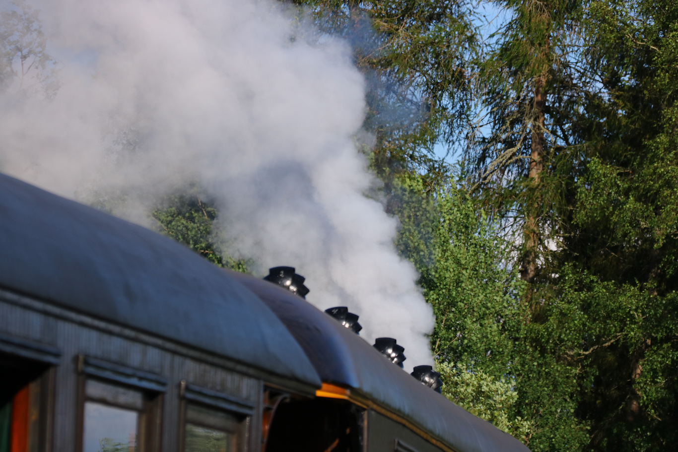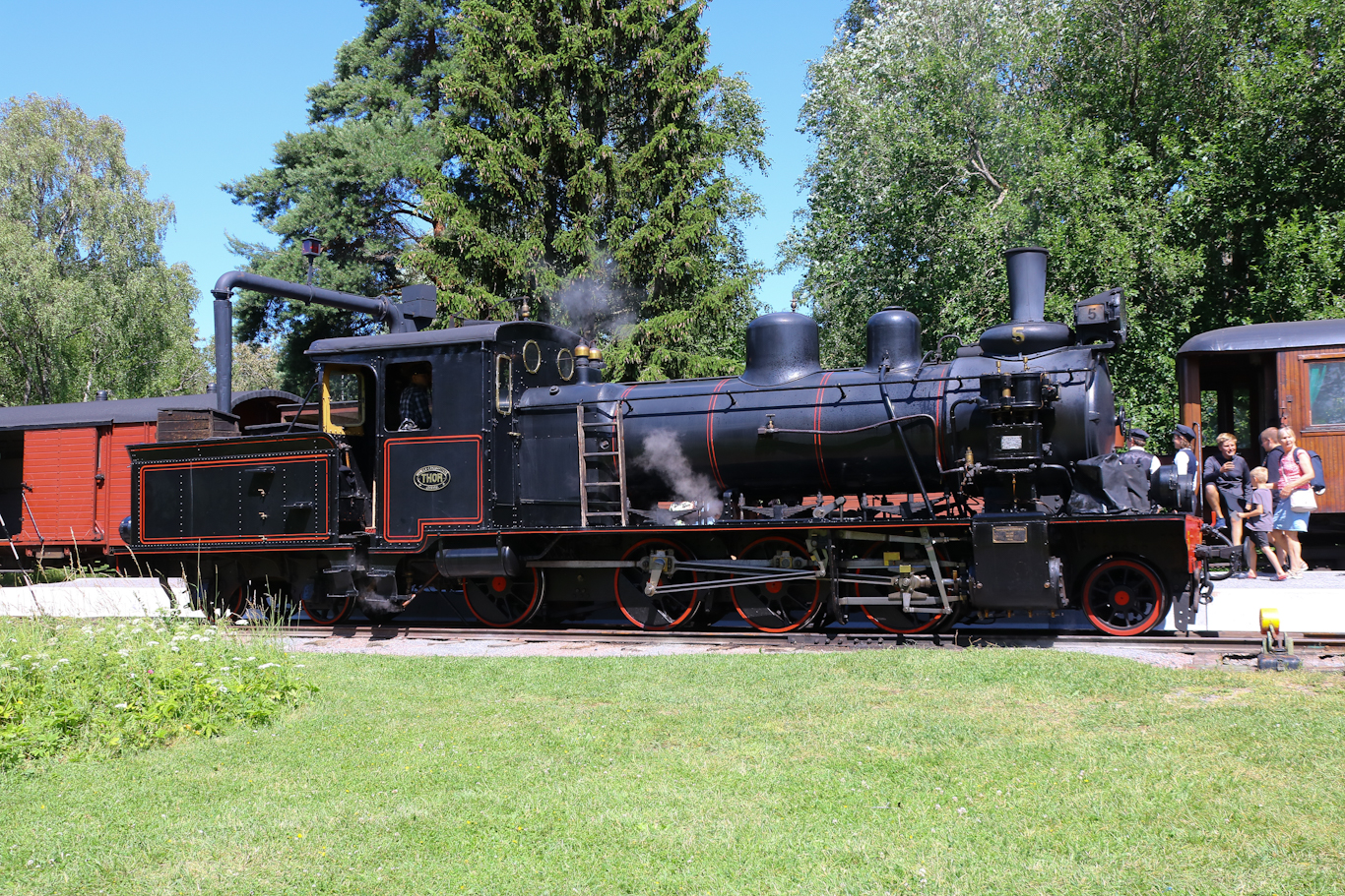 Ca 13:20 så visslades det till bakom kurvan och träden och därmed var det stora ångtåget på ingång mot Marielund. BLJ 5 Thor, som kör många mil varje år i dessa östliga delar av Uppsala, levererades år 1909 till Byvalla-Långshyttan Jernväg i Dalarna.