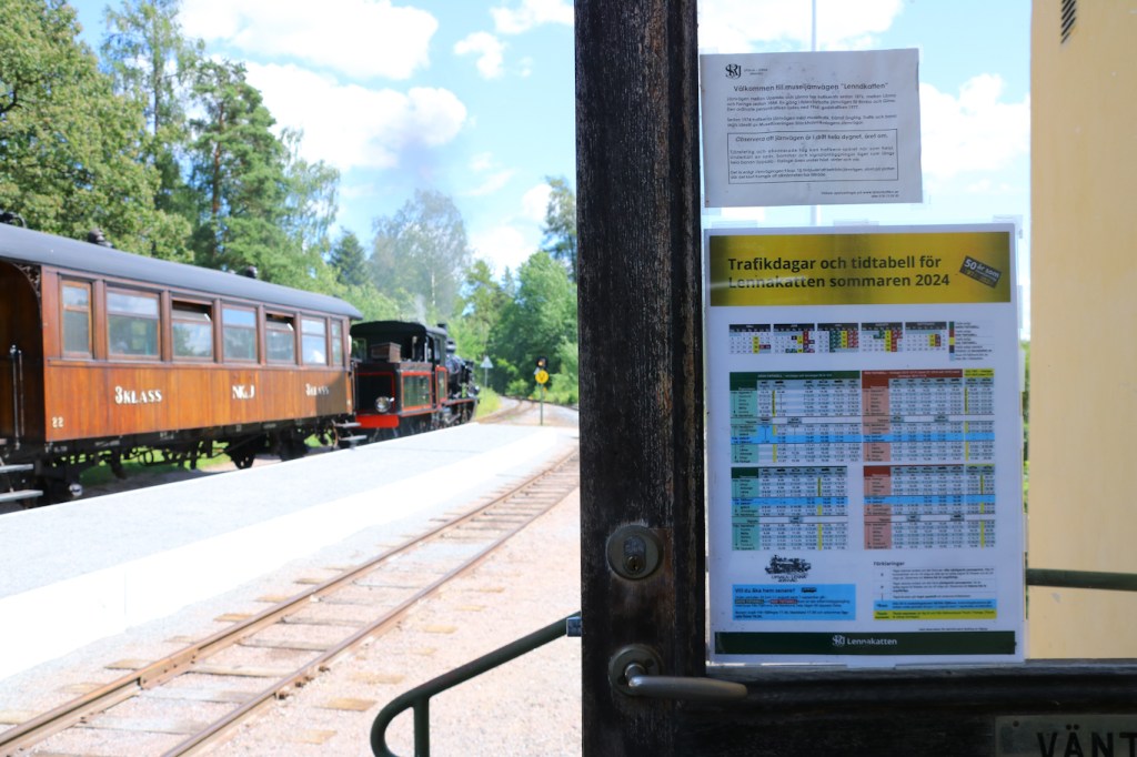 Tidtabell för sommaren på stationshuset i Marielund, och en av de vackra trävagnarna till stora ångtåget.