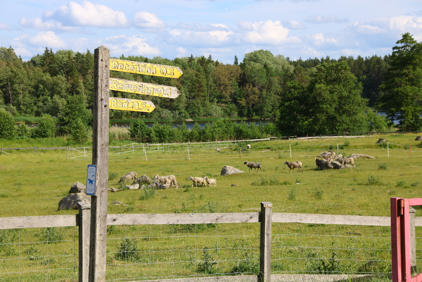 Trivsam gårdsmiljö med får och getter, samt andra djur, intill badet och serveringen. Äventyrsbana fanns också i området för de lystna.