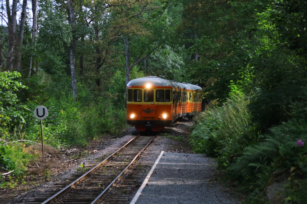 Och där dök det upp i skogen, rälsbusståget mot Faringe.