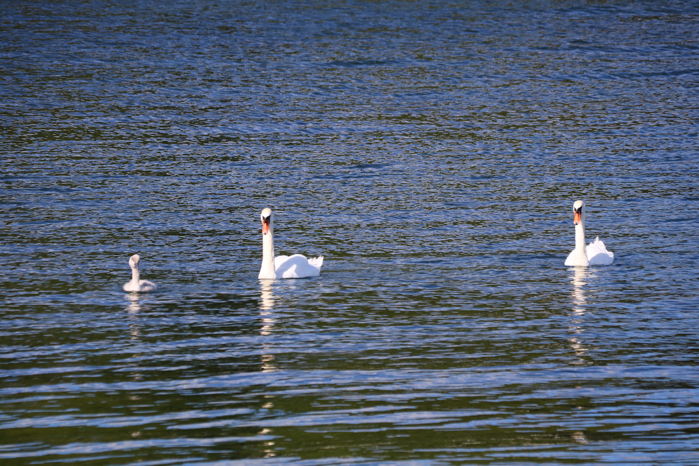 En fin knölsvanfamilj kom simmandes intill bryggan i Östersjö.