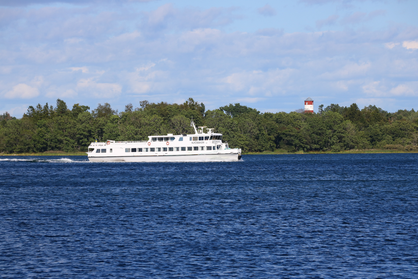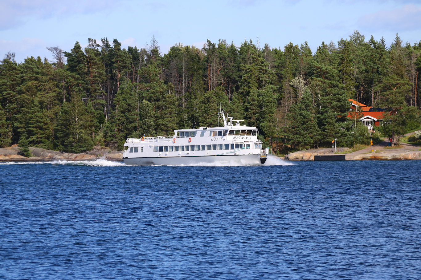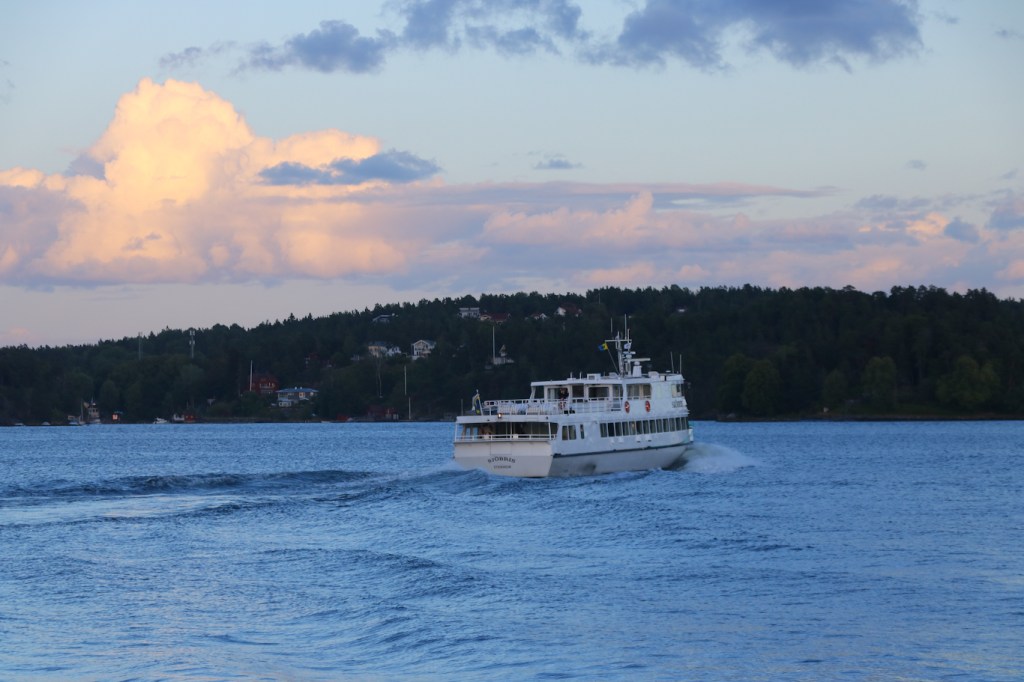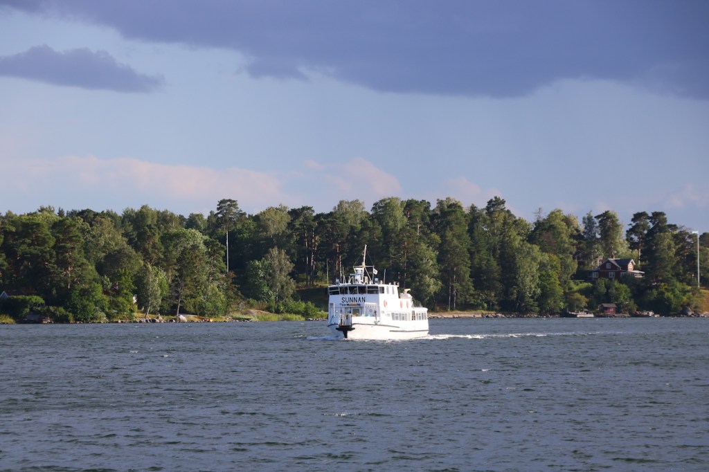 I Blidösundet, utanför Kolsvik på Yxlan, skådades m/s Sunnan på nordlig tur mot Norrtälje. Nord-Sydlinjen som jag denna sommar mest nyttjade på den södra delen, enstaka turer blev det bara med Sunnan i år. Vår och höst går hon annars mellan centrala Stockholm och Tappström på Ekerö, SL:s pendelbåtslinje 89.