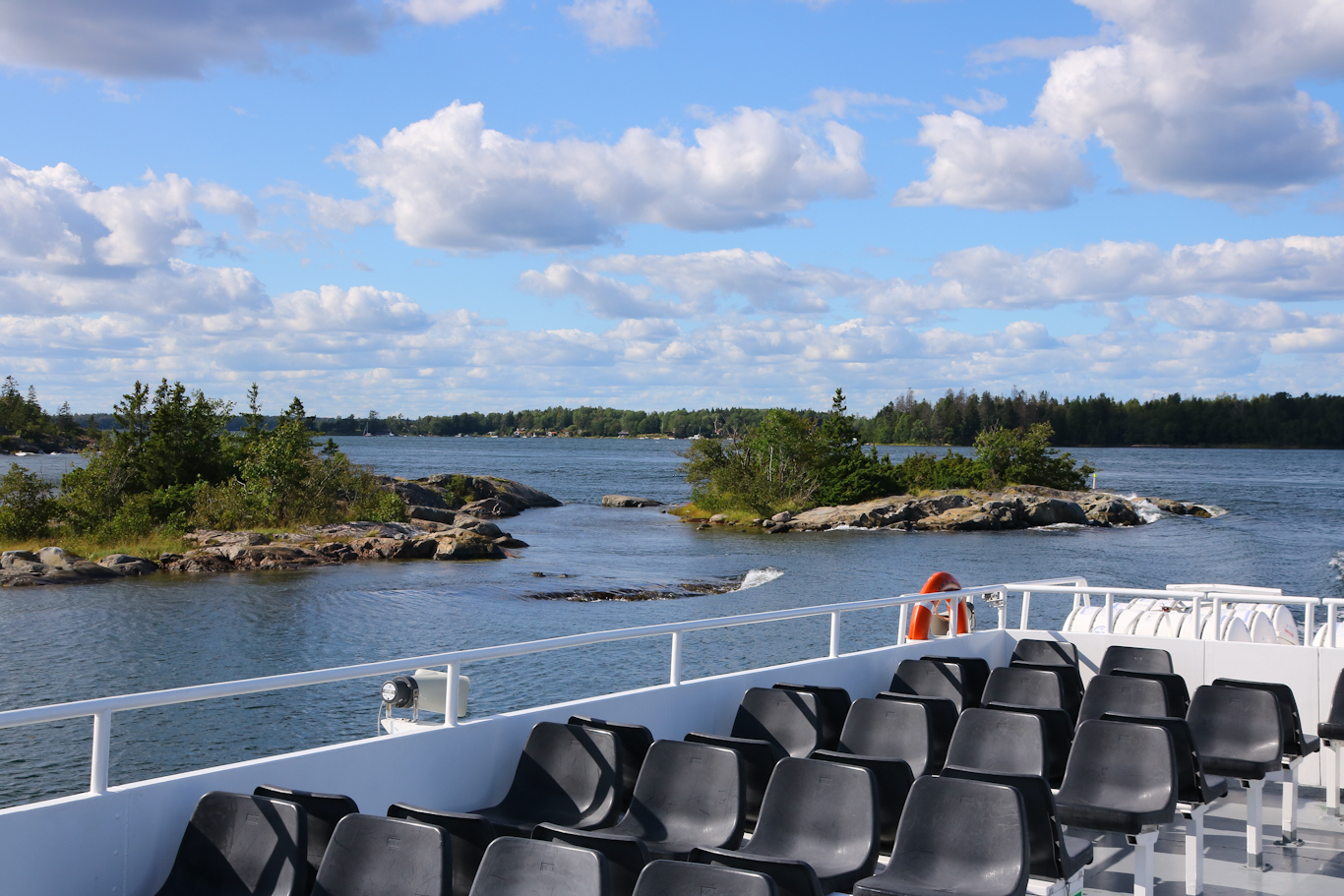 Många stora fjärdar är det i Roslagen, men finns också täta arkipelager däribland mellan öarna Tjockö, Tyvö, Gisslingö och Fejan – i just denna del som kallas Norrarm. Här en vacker passage utanför Tjockö med sikte på Fejan – fast bilden är tagen akteröver. 😉 Soldäcket på m/s Sjöbris rymligt och gott om platser, ja så långt på resan var vi inte här.