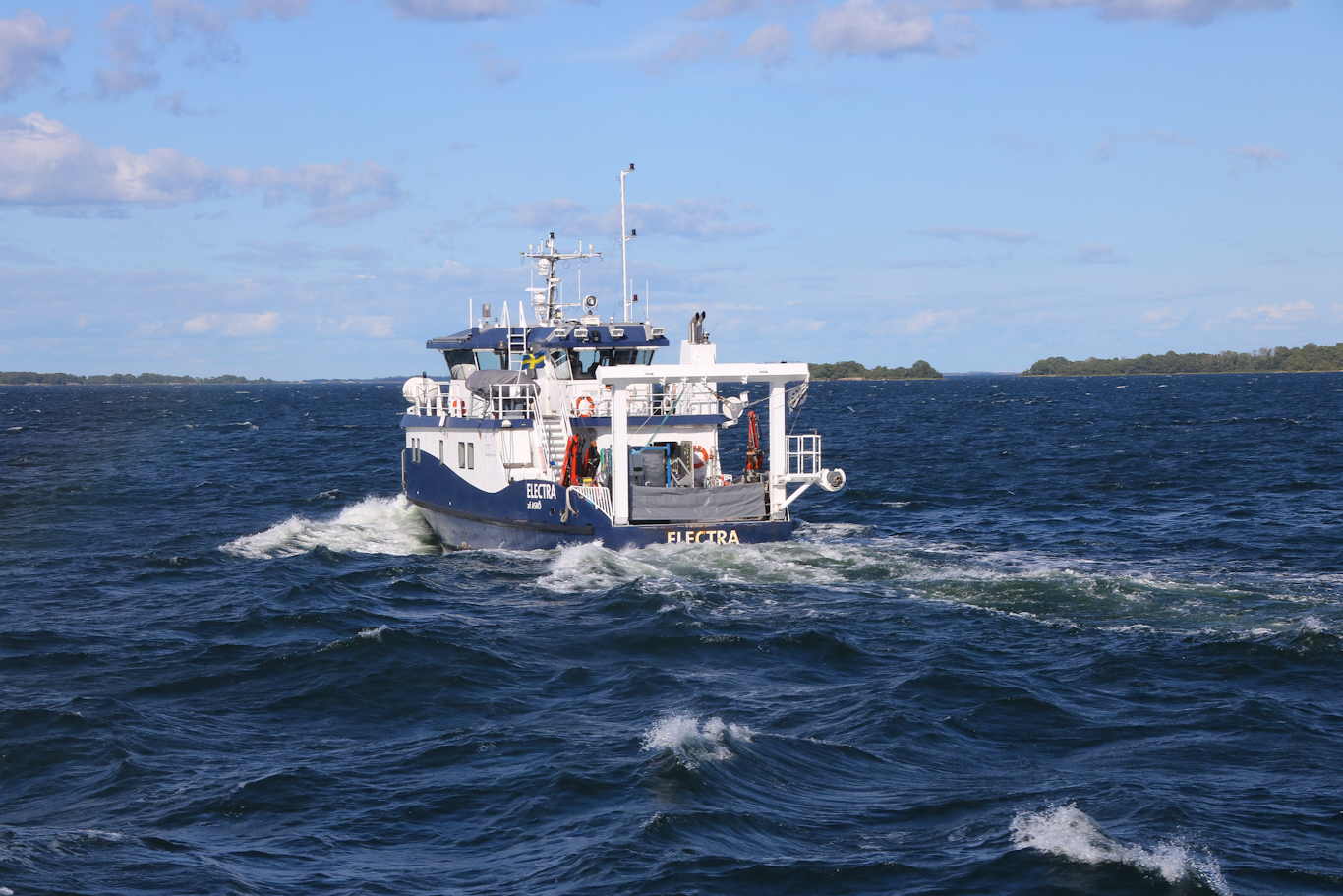 Möte med Stockholms Universitets forskningsfartyg Electra, hemmahörande vid Askölaboratoriet på Askö i Trosa skärgård. Forskning, utbildning och miljöundersökningar bland dess uppgifter. Vid tillfället var hon på väg upp till Sundsvall, såg henne i alla fall där på AIS-sidan någon dag efteråt, och just expeditioner till Bottniska viken är också något hon brukar göra.