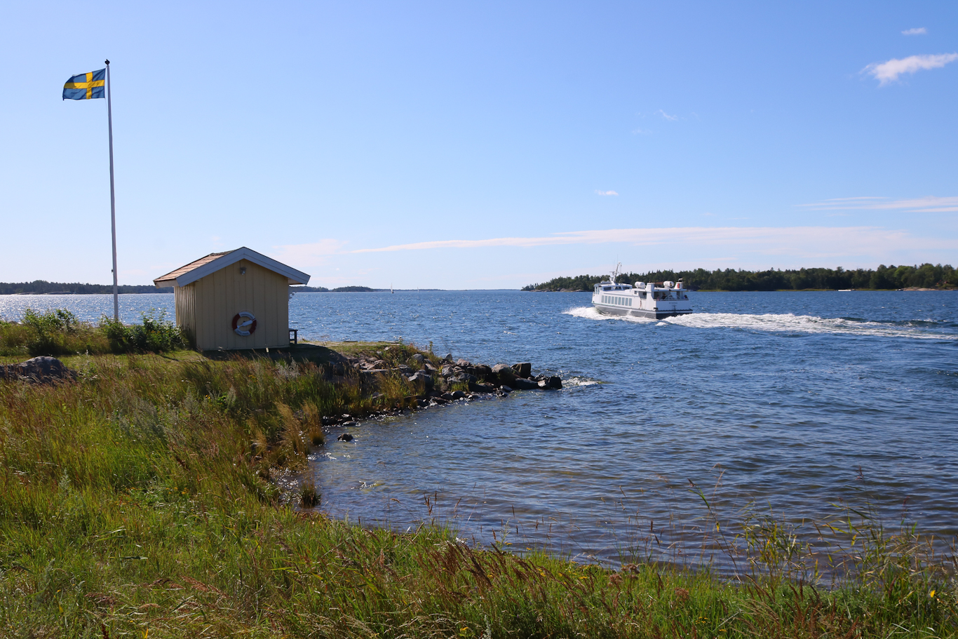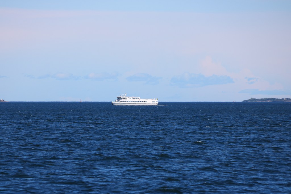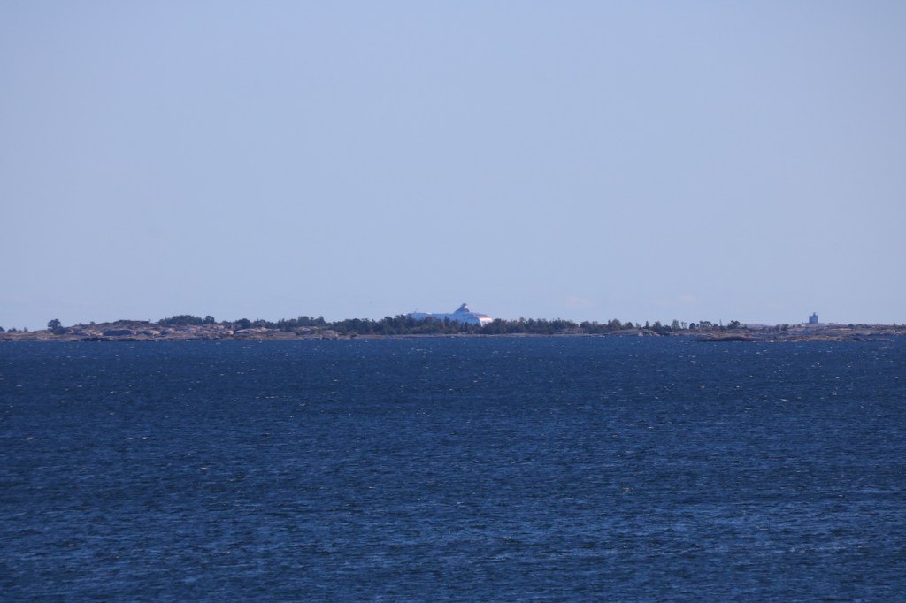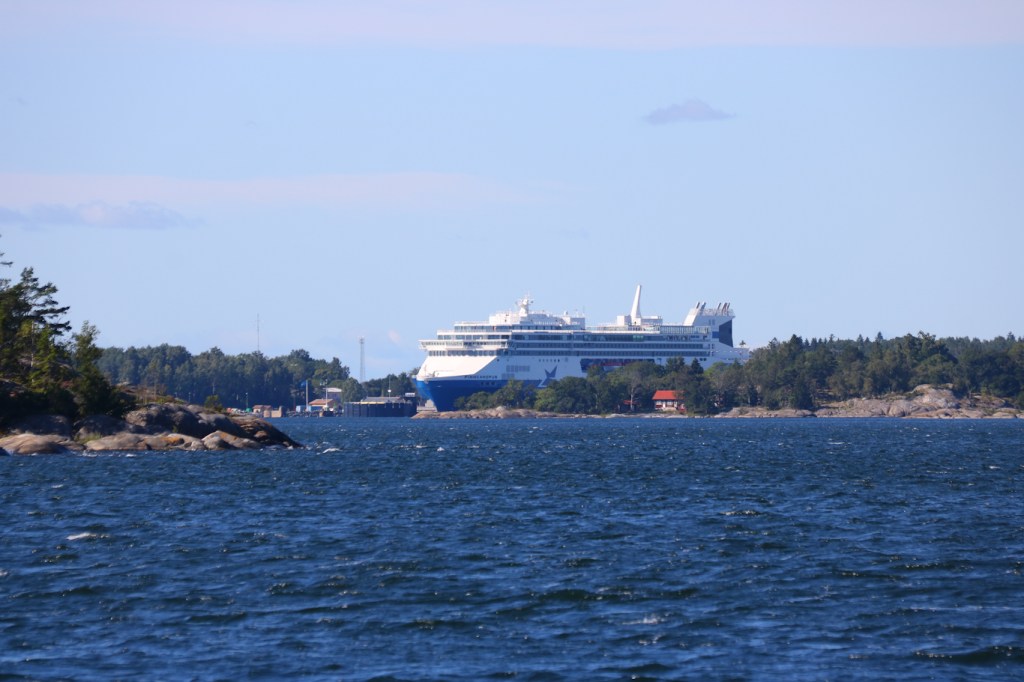 Modern bebyggelse i utskärgård? Nej då, det är bara Tallink Siljas Baltic Princess som var på utgående från Stockholm till Åbo. Till höger i bild syns på håll Tjärven och dess fyr. Området däremellan innehåller många vackra kala utskärgårdsöar, även om det här på bild syns en del vegetation också.