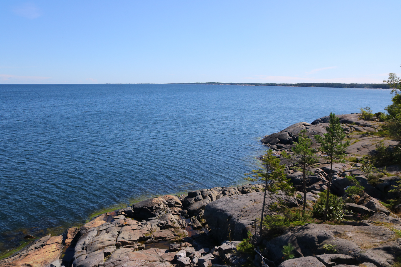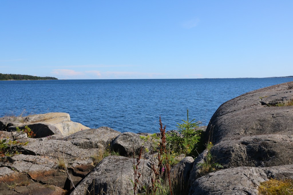Den hänförande utsikten från Norrkalven bort mot Halvssvalget och öarna i Norrarms skärgård med Tyvö och Gisslingö längre bort. Notera de härliga klipporna, det här är en sådan plats man kan stanna till en längre stund för att njuta av den storslagna omgivningen och av den härliga sommardagen.