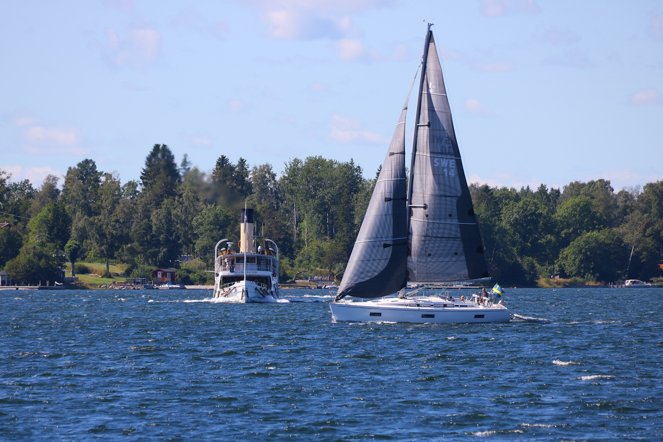 Ångfartyget Blidösund byggt 1911 i Göteborg, och som byggdes som en motpol till Waxholmsbolaget och deras i Blidöbornas ögon undermåliga trafik till Blidösundet. Det blev ju ett infekterat ”Blidökrig” till och med där ångfartyget Waxholm III (som fortfarande finns kvar idag under samma namn men motoriserad) inte tilläts lägga till vid bryggor. Man till och med såpade in klipphällar när Waxholmsbolagets fartyg försökte hitta så att säga alternativa bryggor…Utifrån denna bakgrund så var det allt lite speciellt på midsommardagen att resa från Gåshaga brygga med s/s Blidösund ut till Södra Grinda, med en stor W-flagga hängades på bryggskärmen (alltså fronträcket intill styrhytten). S/S Blidösund har flera midsomrar på senare hyrts in för förstärkning till Waxholmsbolaget – så ”krigsstämningen” är nog sedan länge borta.