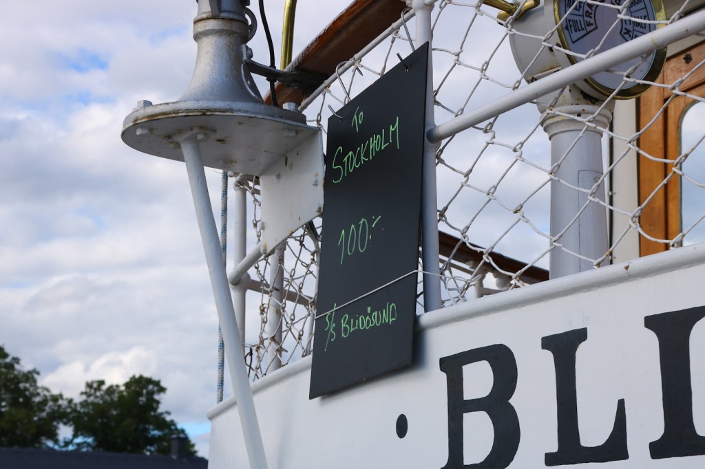 Inför anlöp kl 16:45 i Vaxholm så sattes denna skylt upp. ”To Stockholm 100:-” Dvs för merparten turister som ville åka tillbaka till Stockholm så fanns alltså ett alternativ att resa med s/s Blidösund, och den chansen tog många.