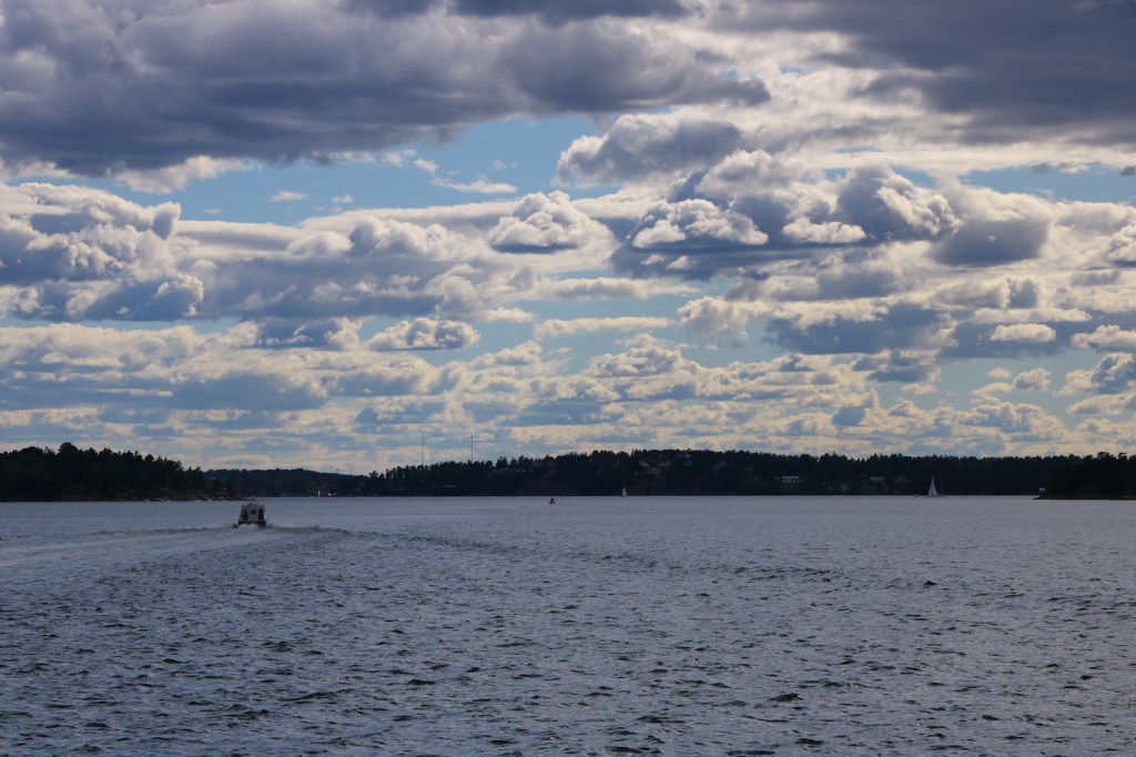 Mot Trälhavet med sikte Resarö föröver. Kan man säga att det var växlande molnighet? 😉 Resarö med Ytterby där flera grundämnen hittades och satt denna del av Sverige i det periodiska systemet.