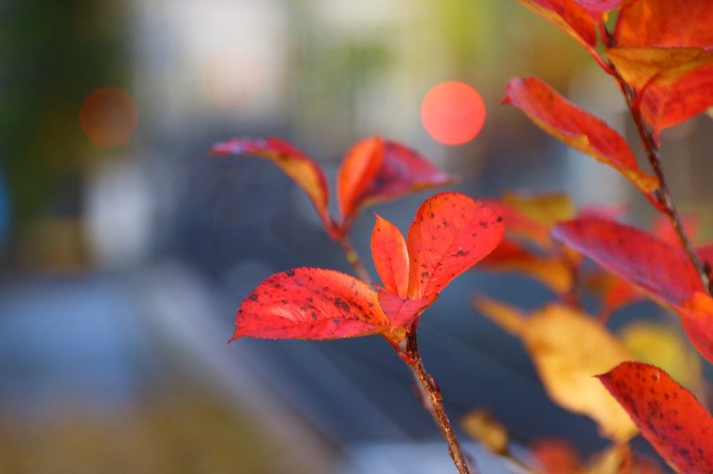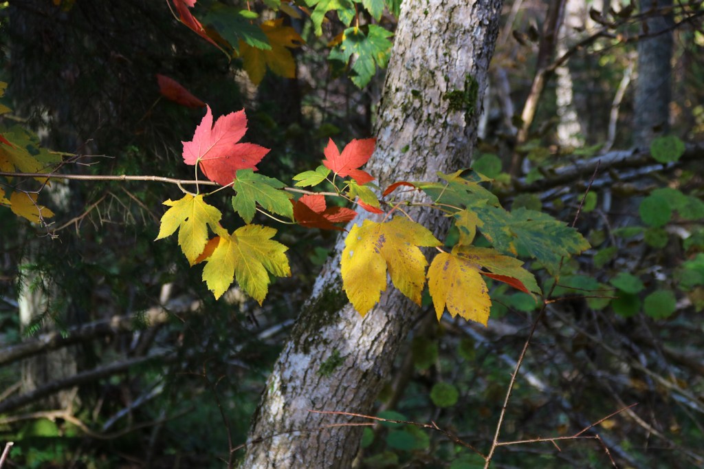 Gröna björklöv mot de brandgula lönnlöven i bakgrunden.