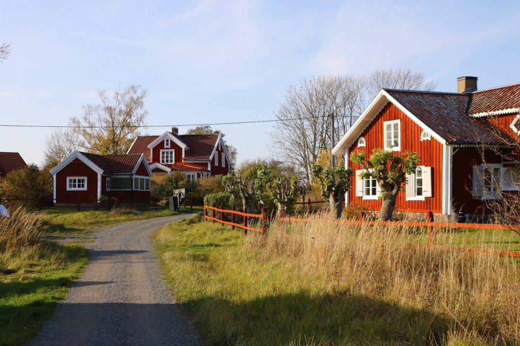 Tillbaka närmare vägkorsningen och dess charmiga bymiljö omkring. Till vänster går man in mot Snickargården, rakt fram mot ångbåtsbryggan och sedan går en väg in till höger bakom det röda huset mot norra delen av ön.