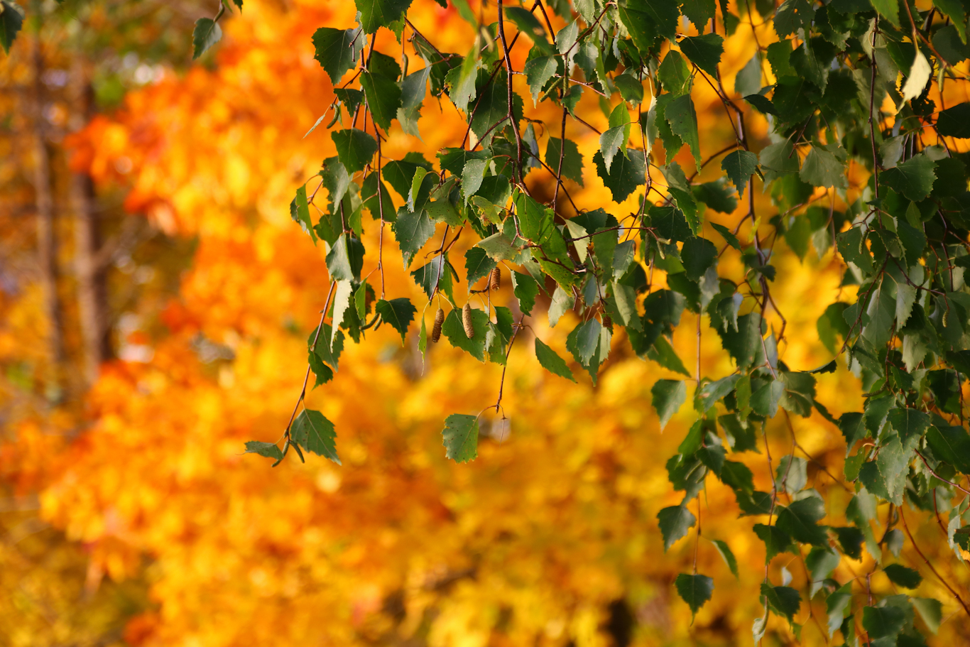 Gröna björklöv mot de brandgula lönnlöven i bakgrunden.