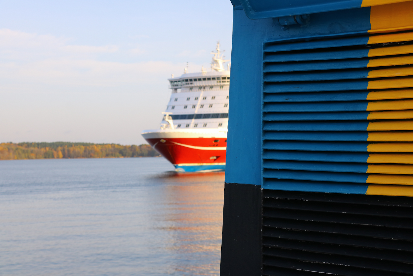 Rött, blått, gult – ja det är ju färgerna i den åländska flaggan. Och en färja dök här upp i m/s Gabriella på ingående från Mariehamn och Helsingfors.