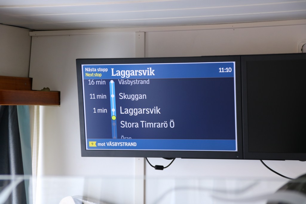 Nästa brygga Laggarsvik annonseras ut en god tid före själva anlöpet på denna skärm. Bara det att vi i föreningen som åkte skulle gå av på bryggan Öran som ligger före Laggarsvik. Sedan lite ironiskt nog så råkade skepparen ropa ut ”Nästa Öran” när vi styrde mot Grundvik, som också ligger på Ljusterö men är den sydligaste bryggan på västra delen av denna stora ö.