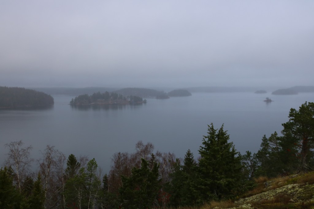 Den magnifika utsikten uppifrån Ljusterö huvud var något disig denna söndag, men nog kunde vyn njutas av ändå. Här togs paus för fika/lunch. Ljusterö huvuds höga läge gjorde det lämpligt för att nyttjas som försvarsanläggning, och denna kom till i samband med att man byggde Siaröfortet på Kyrkogårdsön längre norrut.