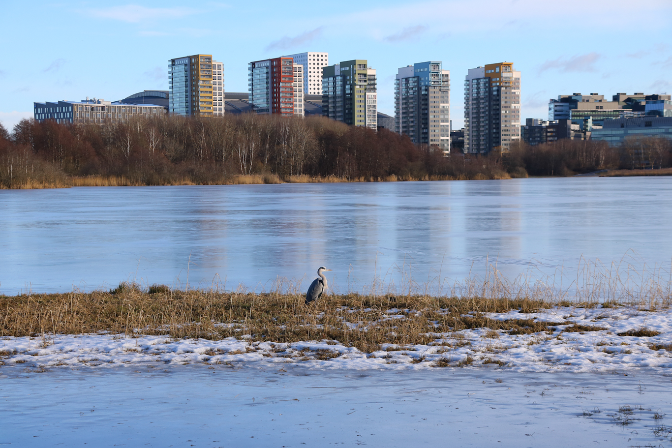 Men det går ju också mot ljusare tider ju längre in i vintern man kommer. Efter en period med kylslaget väder så blev det desto mildare när februari tog vid. Isen på Råstasjön ser här närmast våraktig ut, med en av platsens karaktärer i form av gråhägern. Arenastaden är det som ligger i bakgrunden med dåvarande Friends Arena – den bytte lite senare namn till Strawberry Arena.