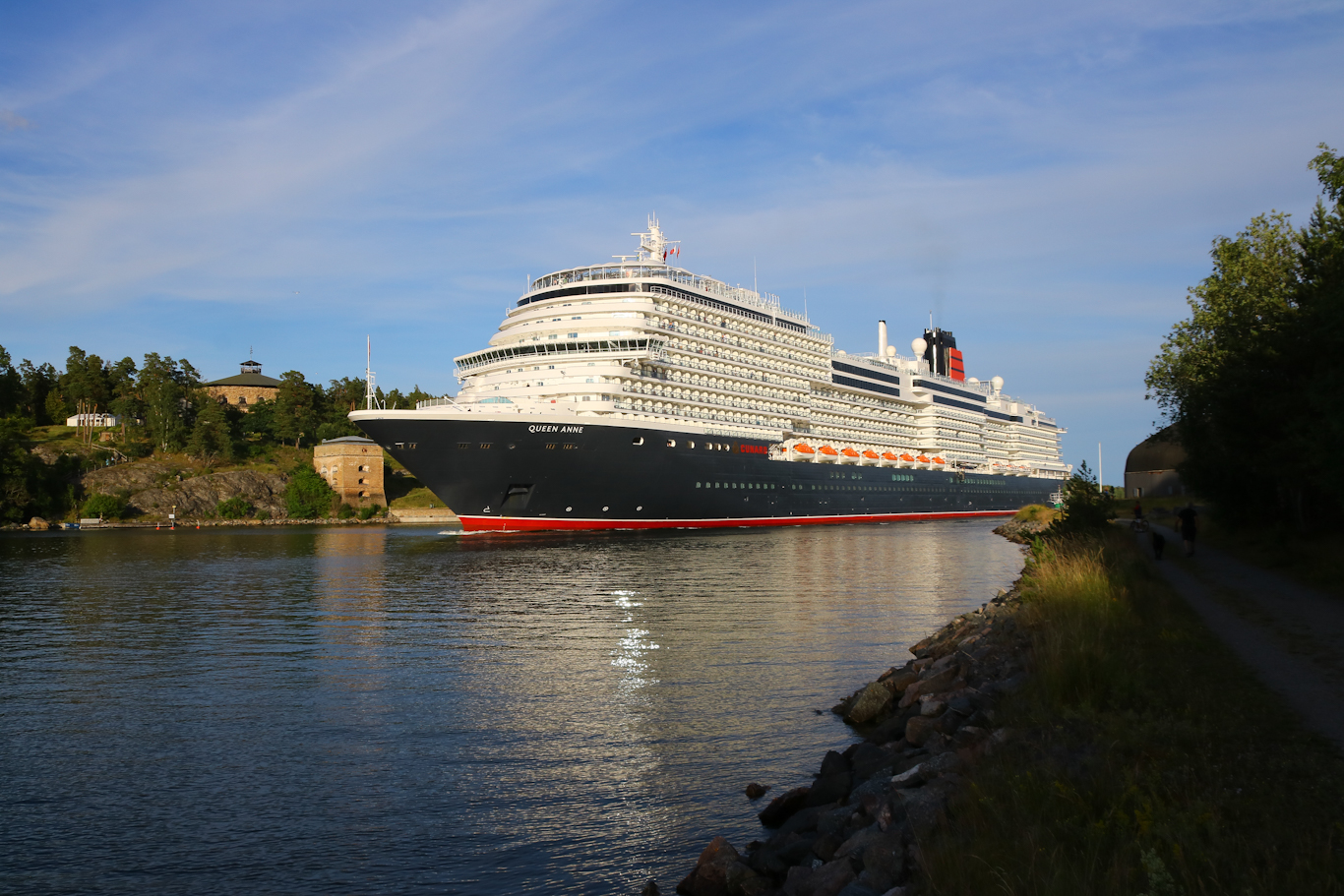 Någon mil norr om Mörtnäsviken och Ålstäket så finns en smal passage där man kommer de stora fartygen väldigt nära mellan Värmdö och Rindö. Oxjdjupet heter detta trånga sund där på bilden den här mäktiga kvinnan från Cunard Line med just namnet Queen Ann passerar på utgående från Stockholm. Jag stod på Rindösidan, hade kommit till Grendjärbryggan med skärgårdsbåt – ca 10 minuters promenad från Oskar-Fredriksborg där nedanför denna fästningsanläggning det finns en trivsam promenadväg.