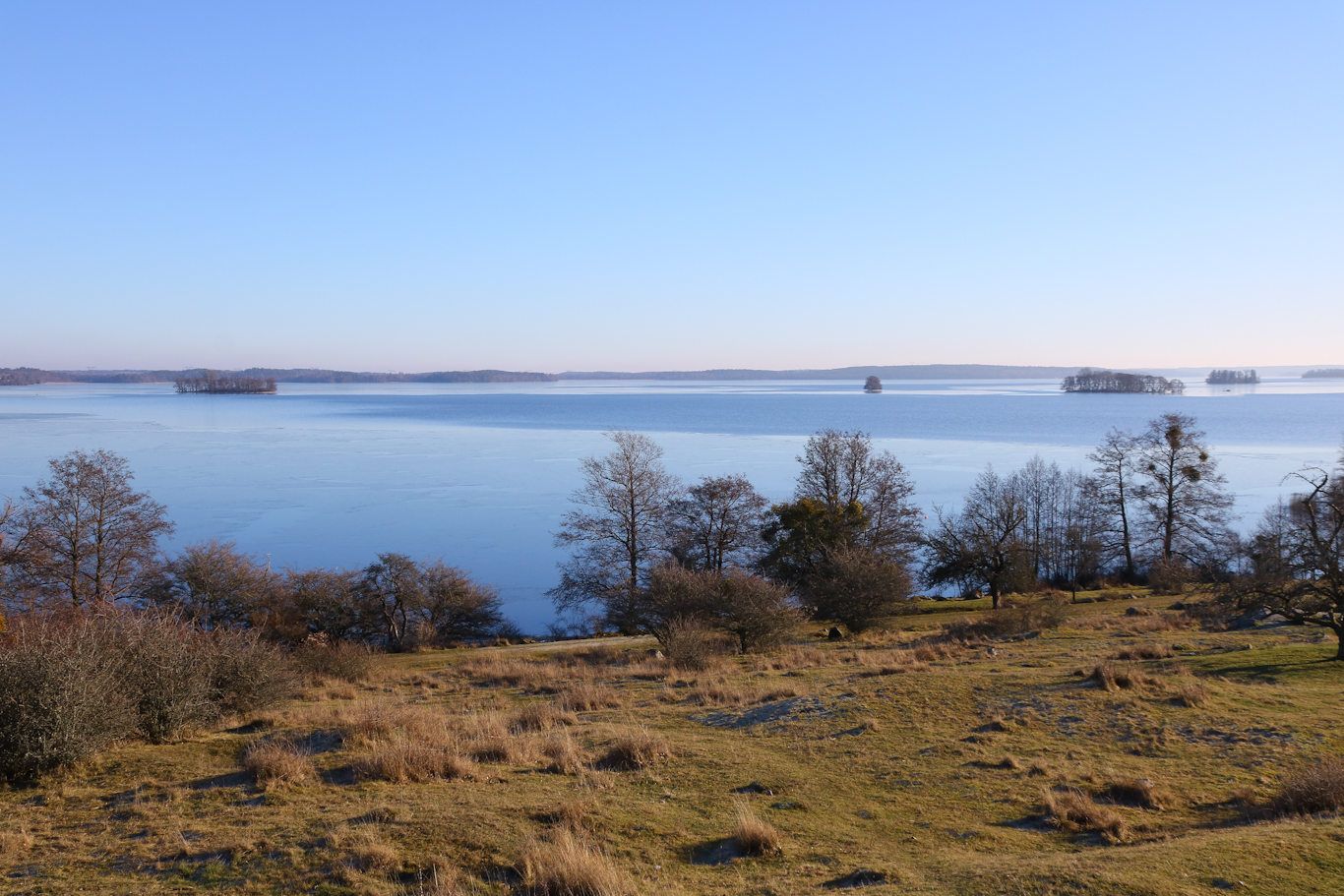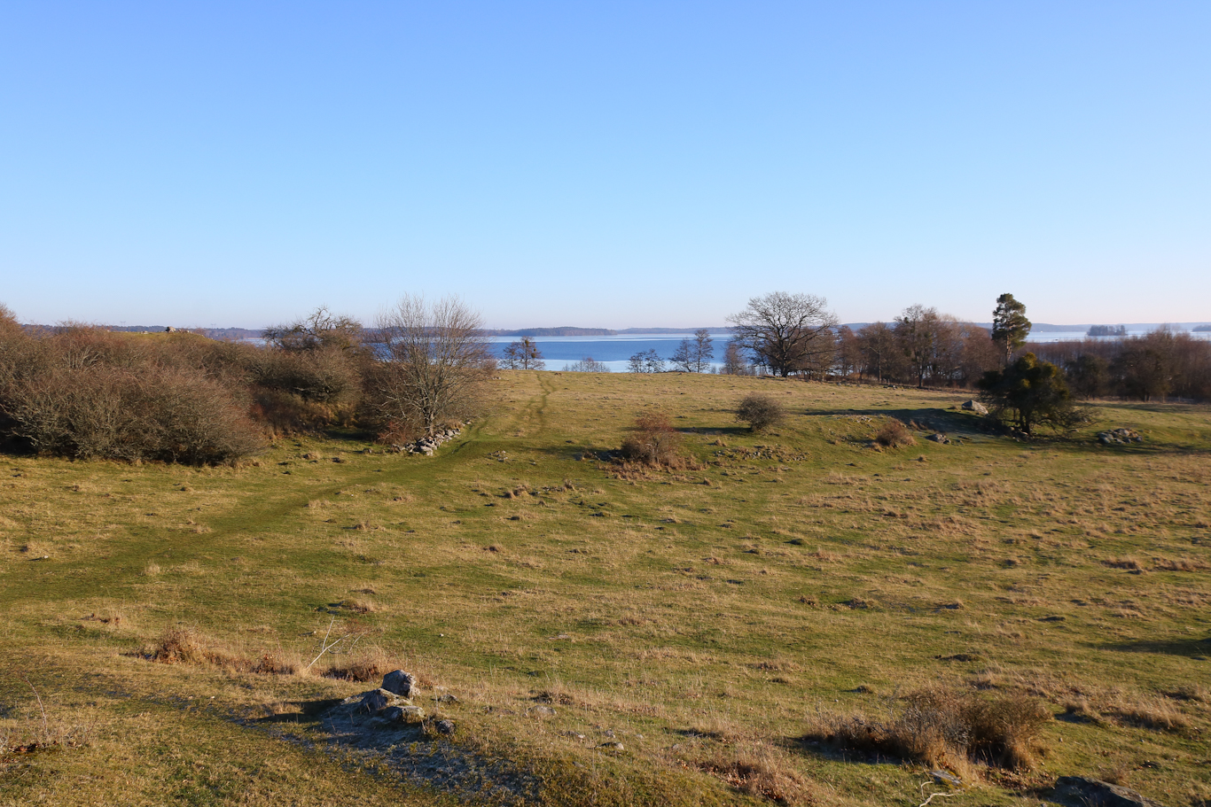 Den mäktiga vyn över Mälaren skådad från fornlämningsområdet intill Adelsö kyrka. Här finns alltså bland annat kungshögar, ruiner och runstenar som talar om en tid som varit – en tid som för platsen var betydelsefull gällande ganska många hundra år – från vikingatiden till medeltiden. Den här måndagen var det lugnt och fridfullt på platsen, inte många fler än mig där.