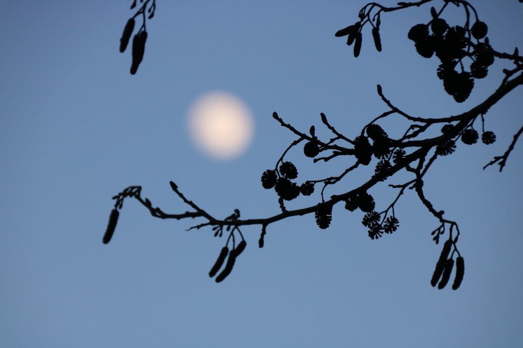 Till nästa trädsort som på bilden skvallrar om al i dess hängen och mindre kottar. I bakgrunden med oskärpa syns månen.