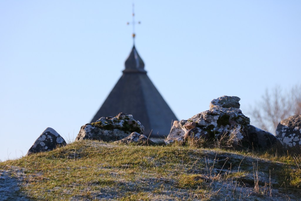 Kyrktornet från en annan vinkel, där ruinresterna av Alsnö hus pryder förgrunden.