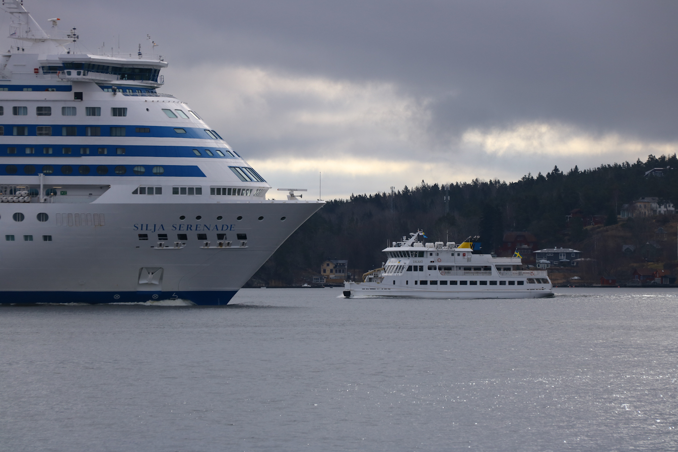Ibland får det giras för de stora färjorna i farleden. Här när m/s Dalarö möter m/s Silja Serenade mellan Hasseludden och Gåshaga. Jag kom ner med spårvagnen till bryggan 09:08 så behövde inte direkt vänta länge då avgångstiden för m/s Dalarö var 09:10.