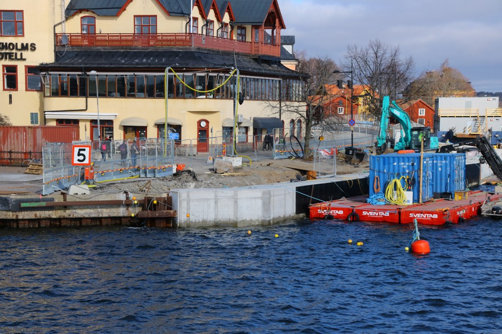 Det pågående kajprojektet i Vaxholm där arbeten är i full gång så väl i Västerhamnen (vid gästhamnen och nära vägfärjeläget mot Rindö) som i Österhamnen (kajsträckan längs Strandgatan som vetter mot sundet mot Kastellet). När Österhamnens kaj är i färdigställande, vilket räknas bli framåt maj-juni, så kommer skärgårdstrafiken att nyttja denna del för anlöp. Söderhamnen vars kaj är i risigt skick kommer då inte ha några anlöp – men den publika ytan ska vara tillgänglig om inte någon akut avspärrning sker.
