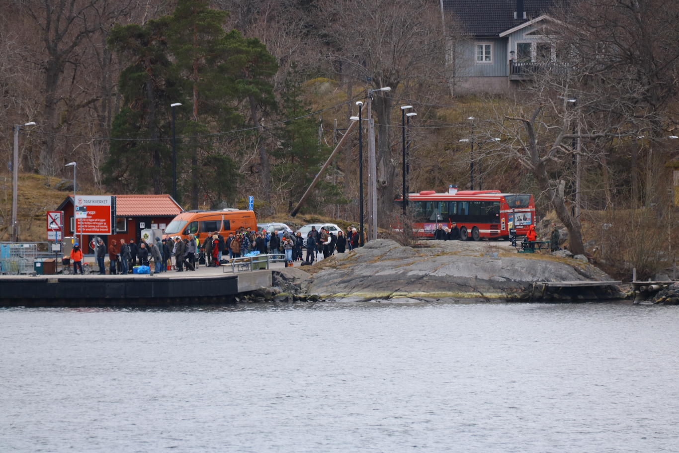 Boda brygga på Värmdö är i alla fall en av dessa flertal i Stockholms skärgårdstrafik. Som synes stod en buss på linje 438 inne, kapten frågade tydligt ut om det fanns intresserade som ville resa med denna då vi var några minuter försenade, men det fanns inga så bussen stack iväg strax efter fotoögonblicket. En del resenärer skulle embarkera däribland mitt ressällskap.