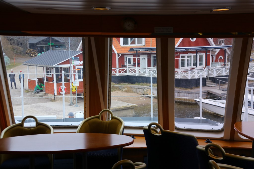 När det blir lugnt i den främre salongen på övre däck – då är det klart att man sätter sig där. 😉 Vid Södra Ingmarsö brygga, en av tre bryggor på Ingmarsö – där en av bryggorna ligger på halvön Brottö. Vid Södra Ingmarsö brygga finns en året-runt-öppen Coop-butik och så Ingmarsö krog.