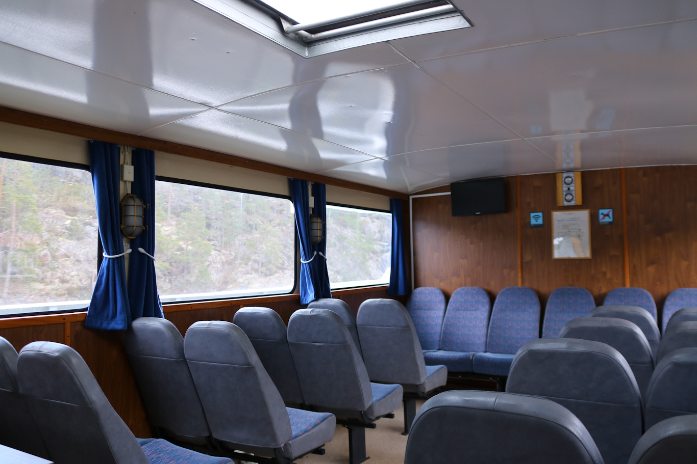 Den övre salongen ombord m/s Nordan. Hon byggdes 1970 i Östhammar som det tredje och sista fartyget i serien som kom att kallas för ”Vindbåtarna”. Det var Waxholmsbolagets första större serie av modernare och snabbgående fartyg som kom att bli Sunnan, Östan och Nordan.