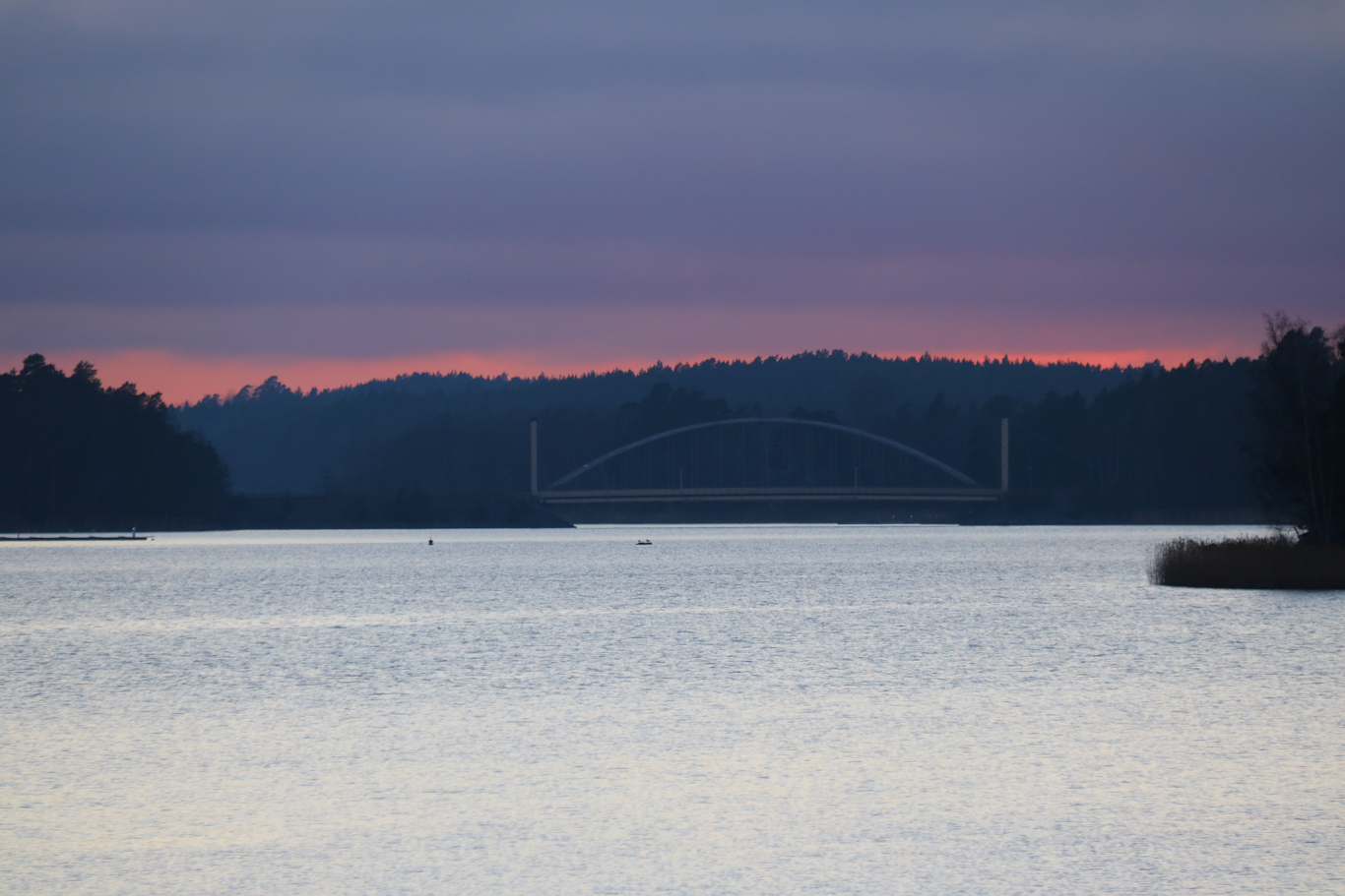 I grånaden syntes lite andra färger korta stunder. Bågen som syns i bilden är bron från Kullön till Vaxholm/Vaxön – den bär namnet Vaxholmsbron sonika. Och det är länsväg 274 från Arninge som passerar över och som går över Rindö bort till Värmdö via två vägfärjeleder.