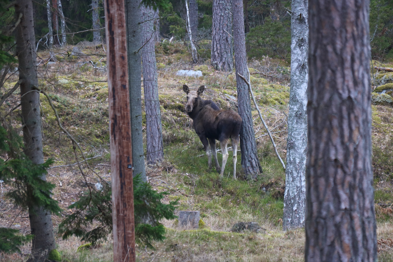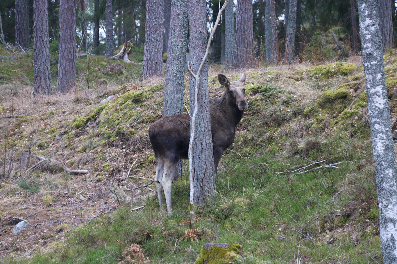 Närmare Lättinge by så fick jag plötsligt ett möte på ca 75 meters håll. Skogens konung – eller kanske drottning då detta är en älgko – stod i en slänt. Mycket häftig naturupplevelse, första gången jag får en älg på bild i det fria.