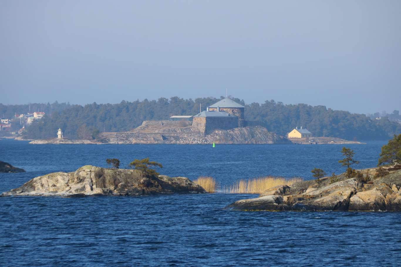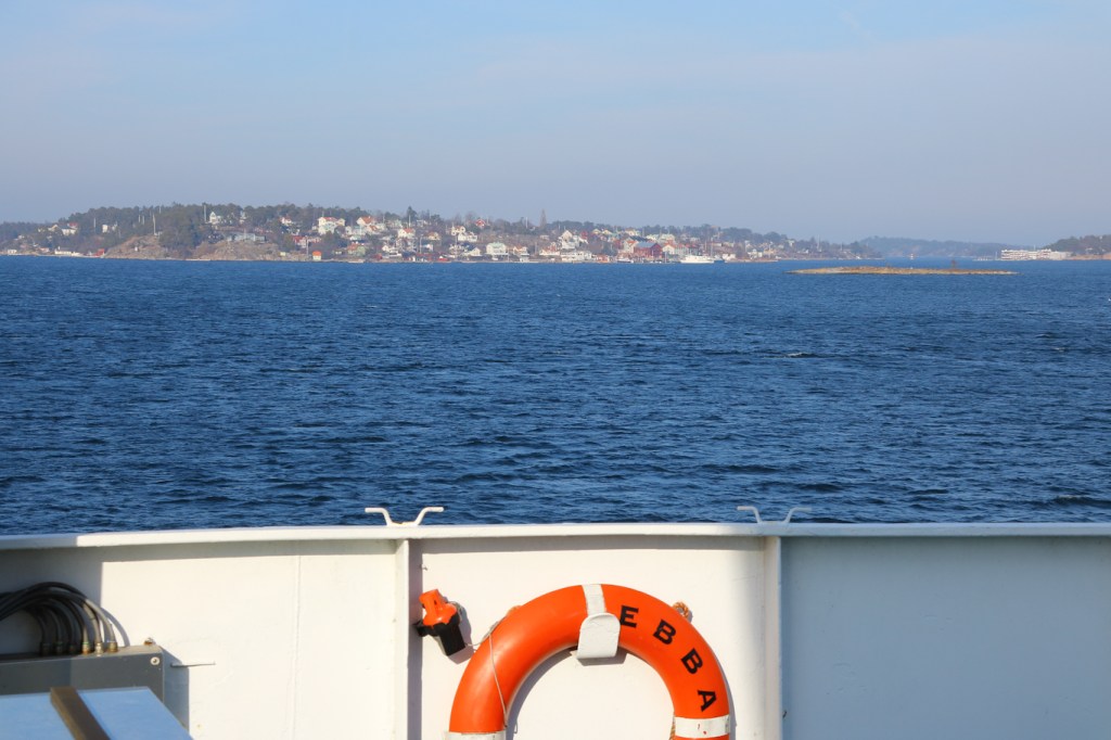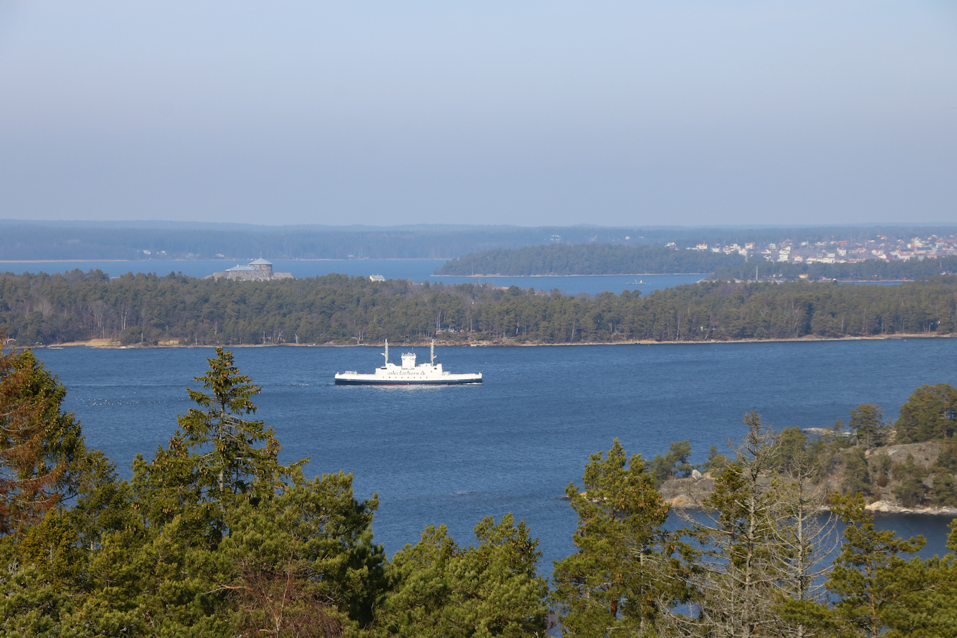Så läckert att Ornöfärjan Ebba kom ifrån Dalarö passande nog i det härliga ljuset. Det hade spruckit upp och blivit en riktigt fin vårdag – och den friska vinden som var gjorde inget då vandringen gjorde en rätt uppvärmd.