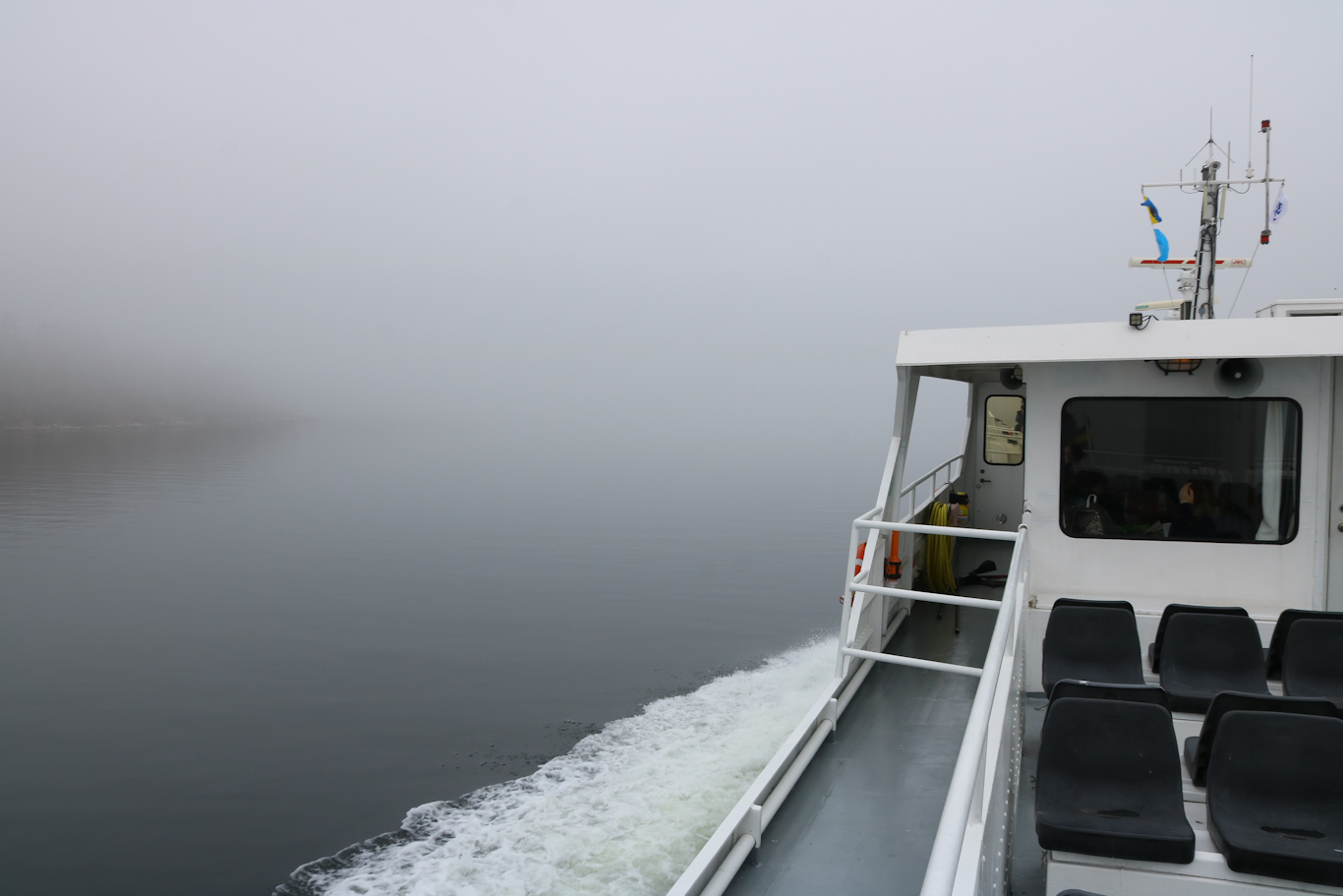Och med dimman i rubriken menar jag alltså den vädermässiga. 😉 Tanken var från början att starta långfredagen med en bussfärd (lång förstås…) upp till Björkö och bytespunkten mellan buss och båt Simpnäs. Därifrån skulle en kvarts båtresa ta mig över till Arholma – för att sedan på eftermiddagen ta första båtturen in till Stockholm för säsongen. Men jag planerade om och startade helt enkelt med m/s Sjöbris i från Stockholm tillsammans med en vän. Avgångstid från Strömkajen kl 10:30.