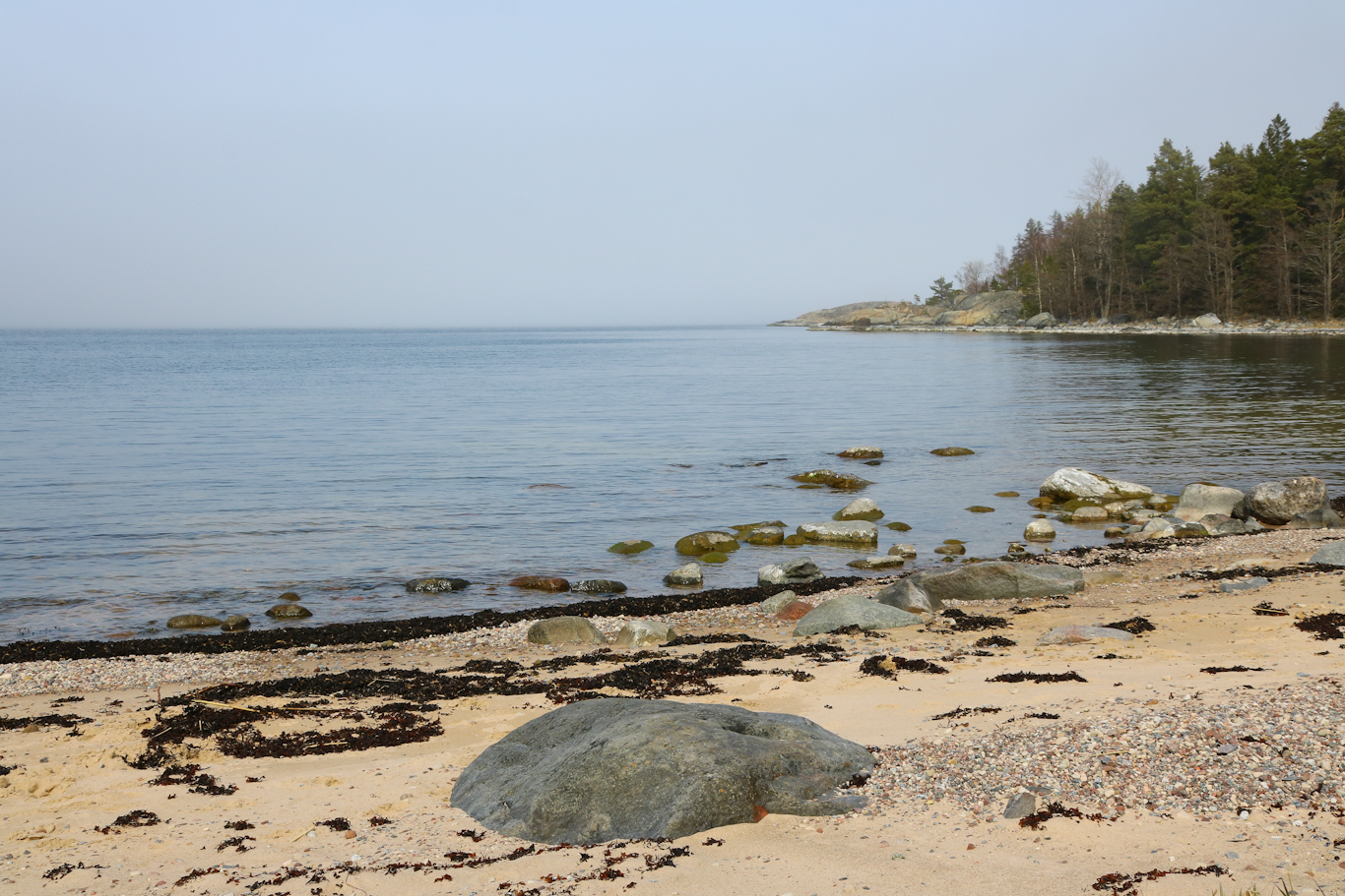 Och denna stig ledde mig till en fin badstrand där jag hann njuta i alla fall någon minut av dess fantastiska omgivning. Nu låg dimman norröver så ön närmast nordvart – Idö – den såg jag inte. Fjärden utanför som löper ut i Ålands hav kallas för Havsvalget – men jag svalde inget havsvatten idag. 😉