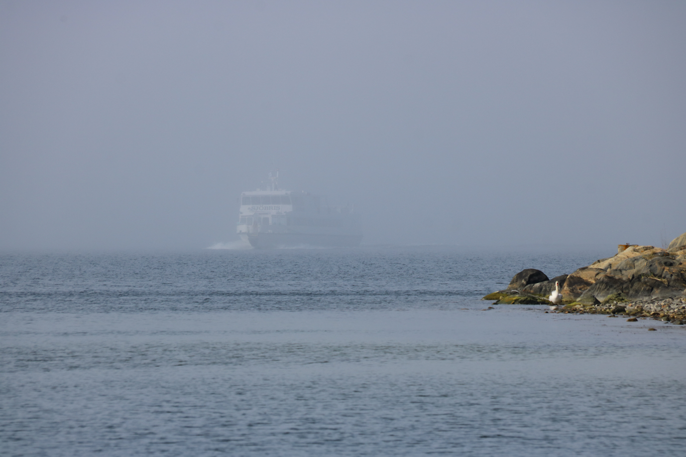 Det hördes bra på avstånd att båten var på väg tillbaka mot Tyvö – men såg gjorde jag inte förrän inte värst många hundra meter från bryggan. Läckert var det när hon bröt sig ut genom tjockan.