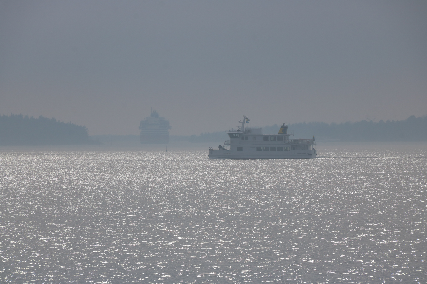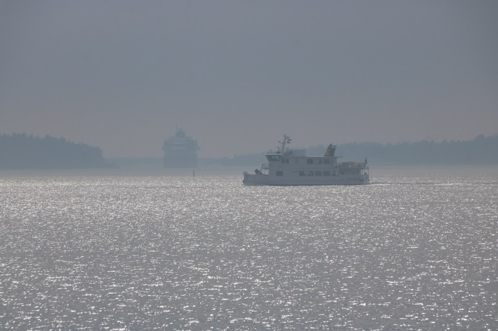 I dimman så hördes tydliga signaler från mistluren ombord m/s Viking Glory, på väg från Åbo och Mariehamn in till Stockholm. Efter Furusund så ska dock tutandet avtagit då det blev klarare sikt längre söderöver. Till vänster i bild syns norra delen på Yxlan – men Yxlan syns även mer centralt i bilden då skärgårdsbåten (den inte helt vackra) bär just det namnet.