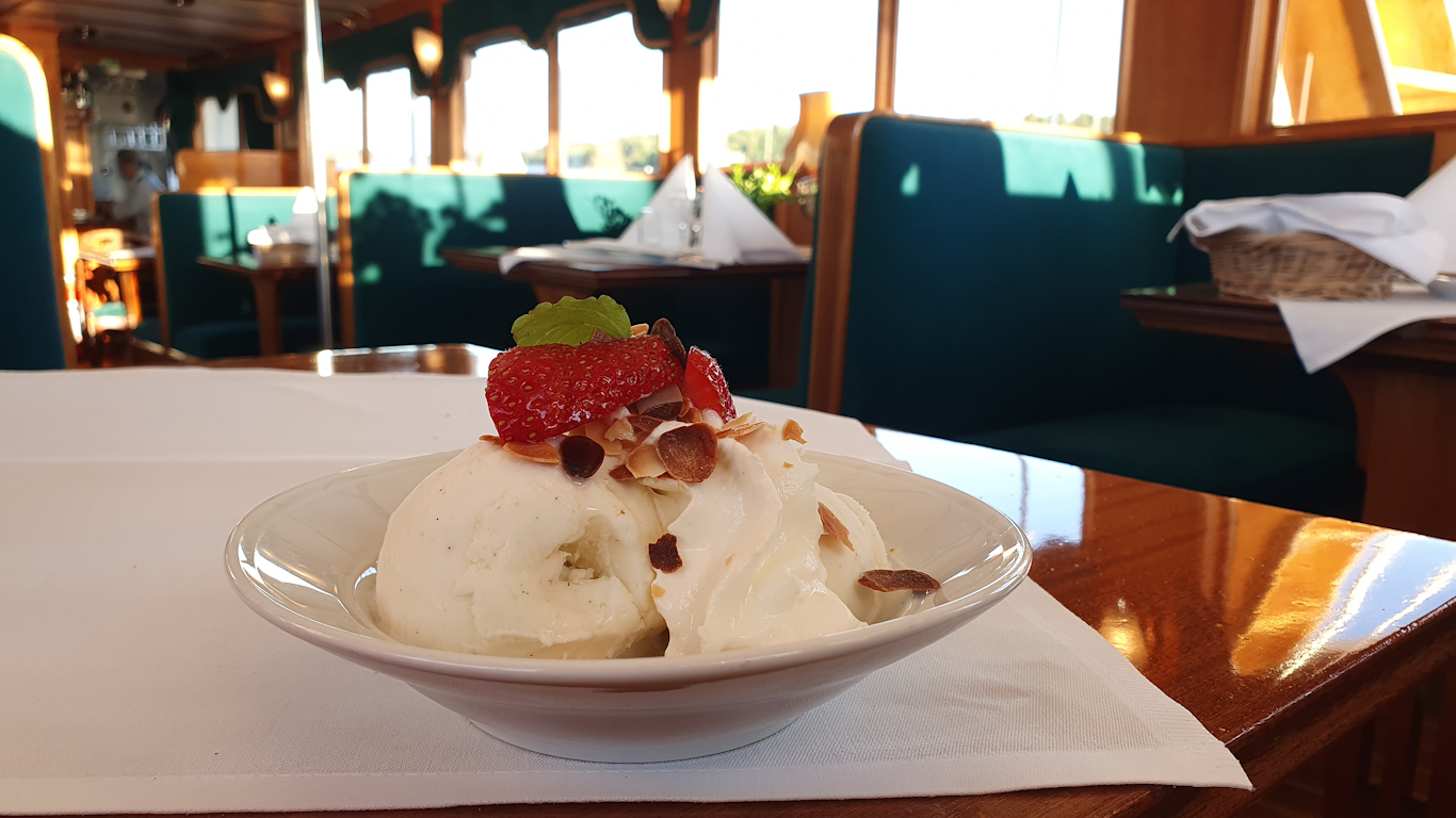 …fartygets vackra matsal. Varför inte en efterrätt i form av Skeppare Bengts glass – det vill säga vaniljglass med jordgubbar, mandelflarn, grädde och inte minst punsch.