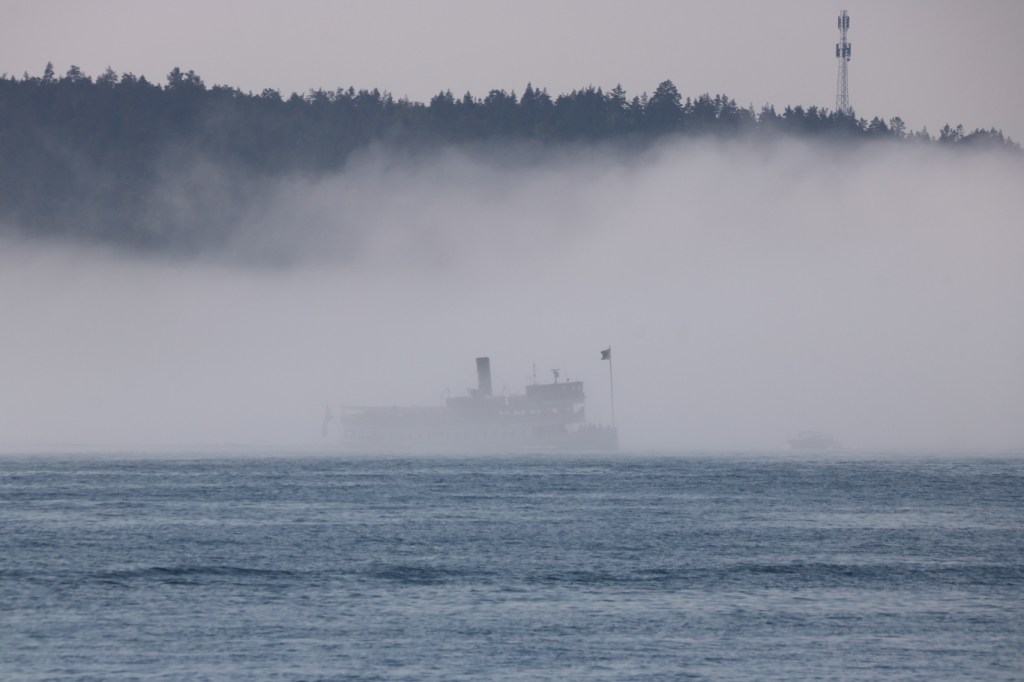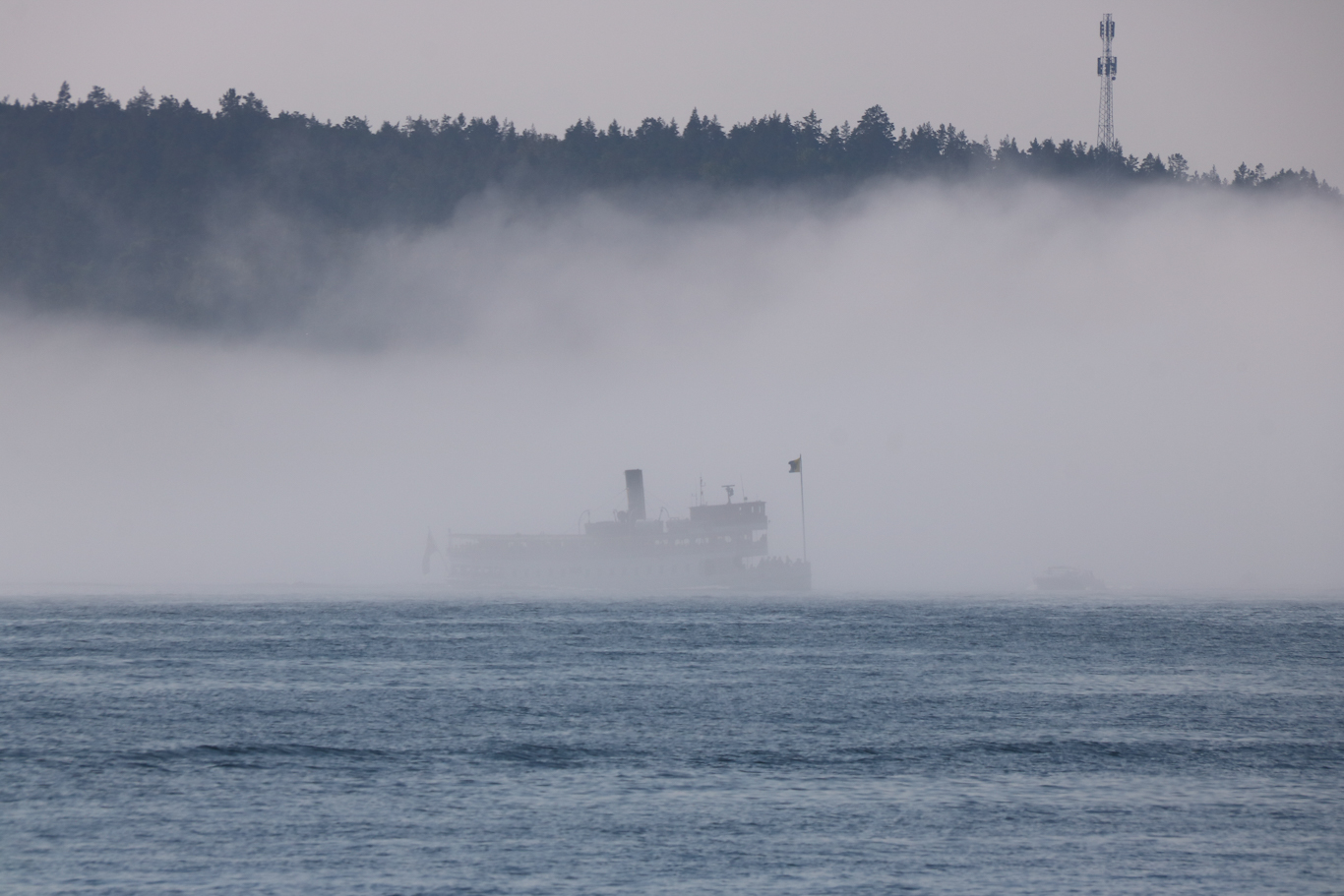 Ut ur dimman kommer här s/s Norrskär från Hasseludden under en lördagstur på väg mot Gällnö den 7 september.
