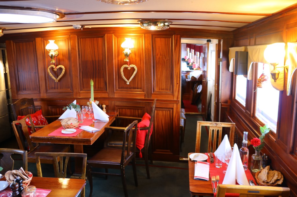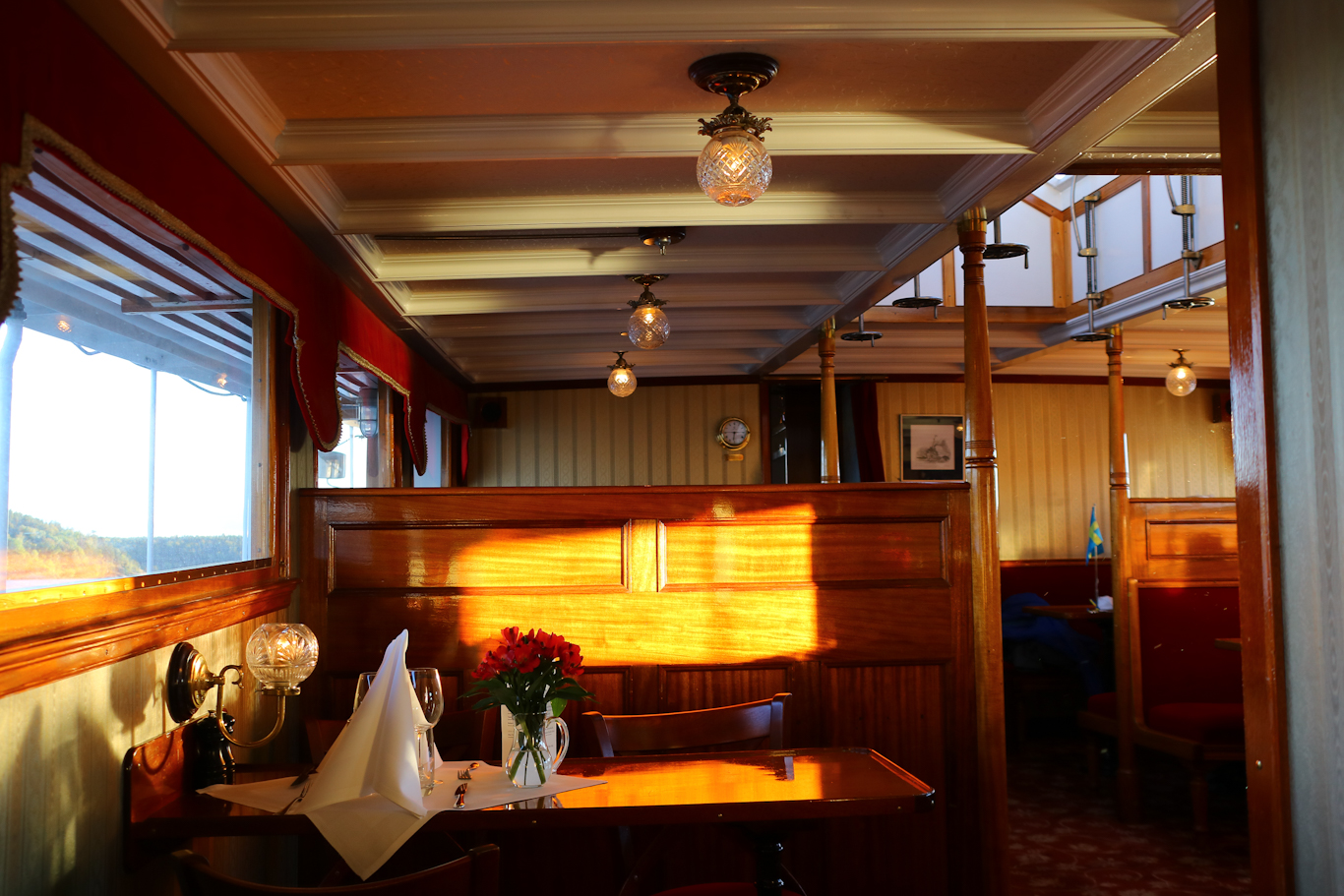 In i matsalen och äta god mat kan man göra på ångfartygen – serverad av engagerade och härliga servitriser och servitörer. Bilden visar från första tillfället någonsin jag åt i Storskärs vackra matsal – och det gjorde jag på min sista resa med fartyget för säsongen 2024. Och dessutom efter Vaxholm på en intur från Möja – bättre sent än aldrig… 😉