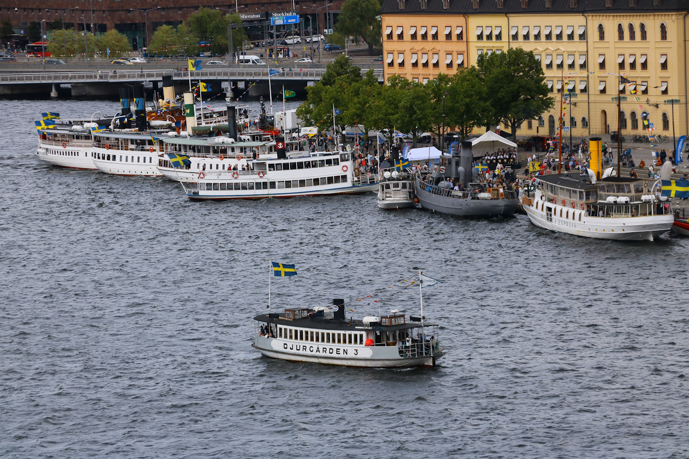 Ett av de stolta fartygen vid detta evenemang – s/s Björkfjärden – fyller i år 100 år. Numera går hon mycket sparsamt i trafik, ägs av Wallenius, men var med på detta tillfälle förra året. Hon hette tidigare Saltsjön och gick då i trafik många år Stockholm-Saltsjöbaden-Dalarö-Utö. Jag minns när ångvisslan signalerade vid Dalarö kl 12:10 och 17:30 helger sommartid.