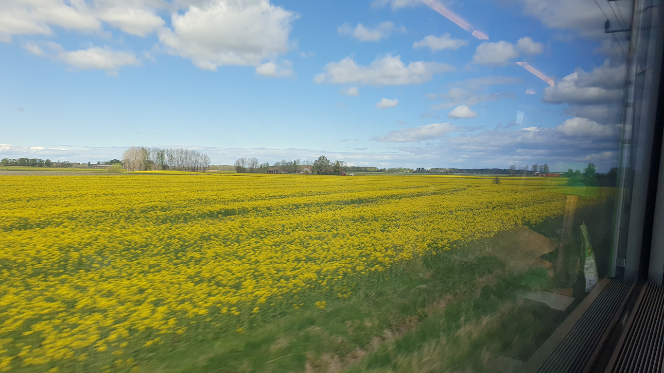 Rapsfält som blommar är vackert det – och det kan ju avsluta detta reportage. Tågresan gick finfint till Stockholm dit jag ankom på tidiga eftermiddagen.