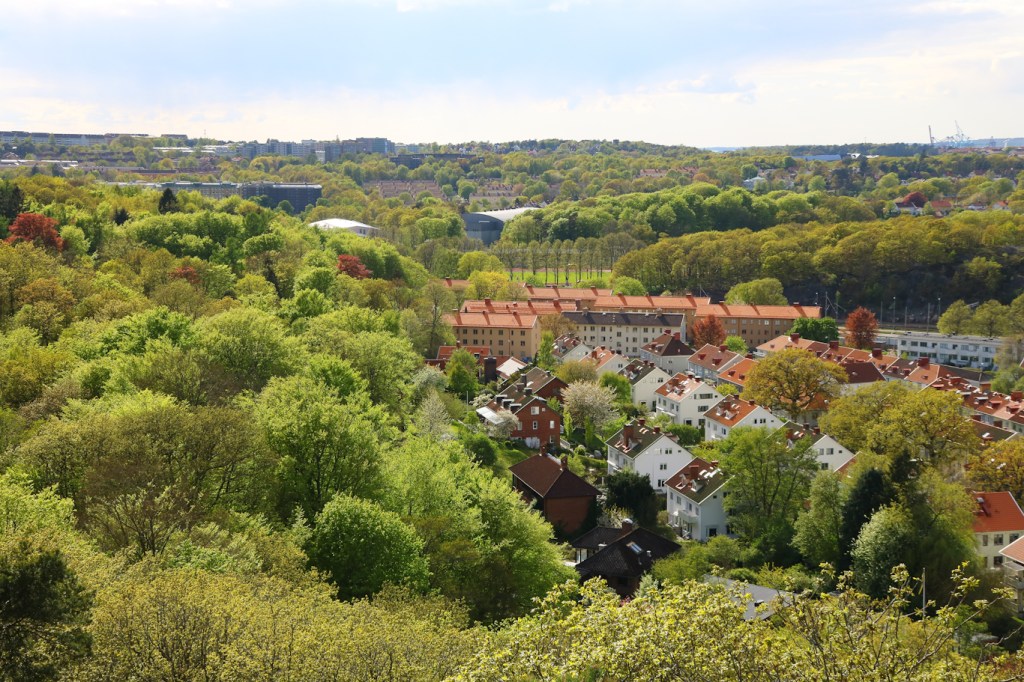 Från Håberget har man fin utsikt över omgivningarna. Bostadsområdet nedanför är Änggården. Längre bort i bild finns en idrottsanläggning vid Frölundaborg.
