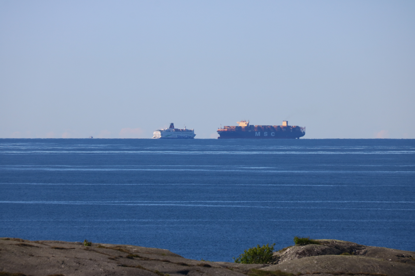 Stor och liten när ett MSC-fartyg möter Stena Danica ute på Kattegatt.