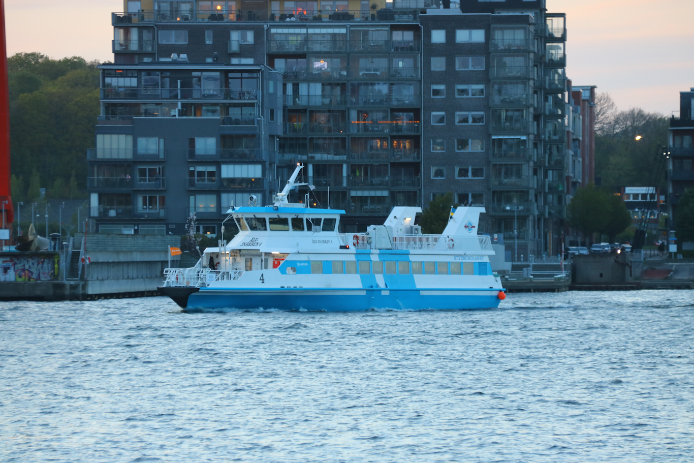En tur på ”älva” – dock strax efter klockan åtta med nummer fyra. M/S Älvsnabben 4 som körde kvällsavgången från Klippans färjeläge in mot Stenpiren och dess resecentrum. Alltid trevligt att ta en tur på Göta älv – och ombord i Älvsnabbentrafiken så är det vanlig Västtrafik-biljett som gäller. Sedan finns det en gratislinje mellan Stenpiren och Lindholmen med högskoleområdet vid Chalmers – och den trafikeras av de så kallade Älvsnabbarna vilket inkluderar färjorna Eloise, Elvy, Älveli och Älv-Frida. Som namnen kanske skvallrar på Elvy och Eloise så är det elfärjor.