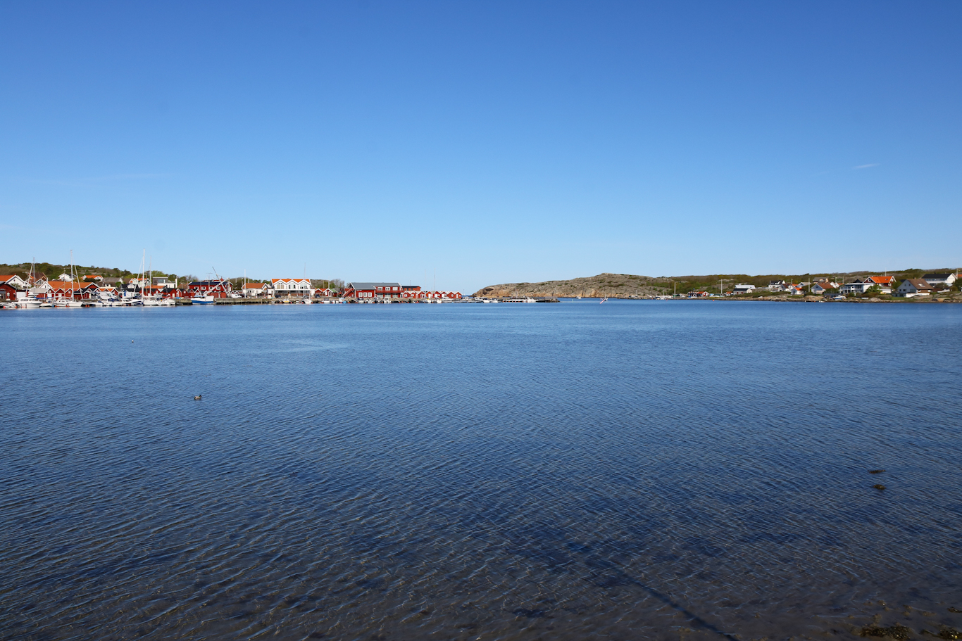 Jag gick av busslinje 290 vid hållplats Hönö Norra – och här visar då bilden viken eller maren intill hamnen Röd på Hönö. På andra sidan ligger Öckerö och däremellan går ett sund i västlig riktning mot Kattegatt.