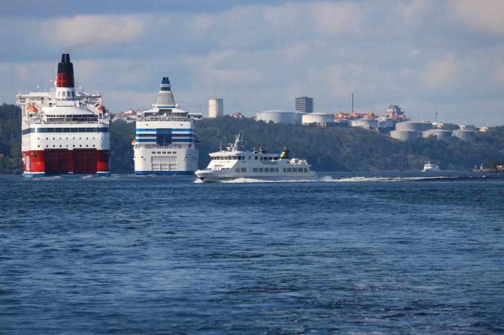 Finlandsfärjor på väg in till Stockholm, medan skärgårdsbåtarna är på väg ut i Stockholms vidsträckta arkipelag. Snabbåten närmast i bild är m/s Viberö – och vad namnet beträffar så ligger Viberön strax söder om Arholma. Det byggdes fem större snabbåtar i början av 1990-talet för Waxholmsbolaget och alla fem båtar fick ö-namn på V. Värmdö, Vånö, Väddö, Viberö och Vaxö. Dessa utgör efter 30 år drygt fortfarande stommen i skärgårdstrafiken.