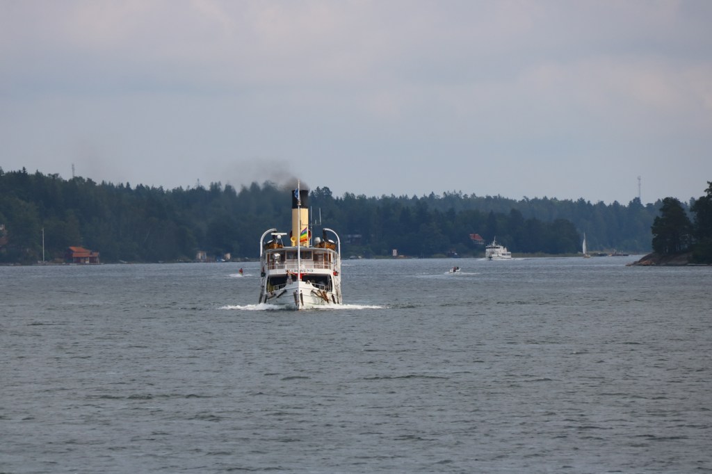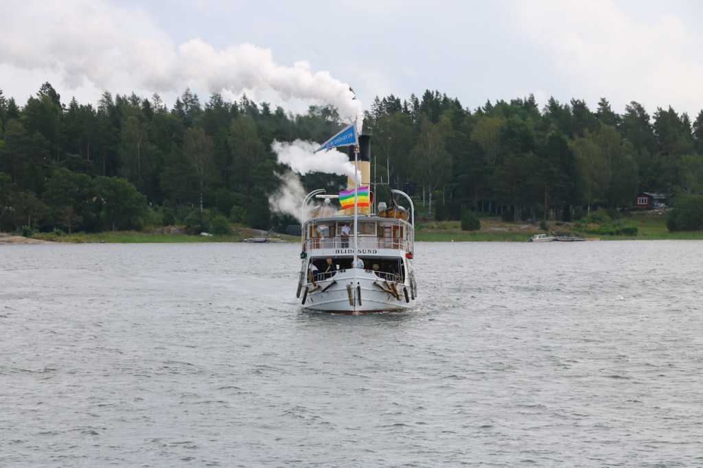 Stolthet på flera sätt – inte bara i ångaren utan förstås också i att det var Prideveckan den vecka som var. S/S Blidösund som söndagar denna sommar gör turer till Svartlöga med utgångspunkt från Furusund med flera bryggor i Blidösundet. Från Stockholm kan man ansluta vid bryggan Glyxnäs på Blidö för att åka med till Svartlöga – eller så kan man göra som jag gjorde och åka m/s Sjöbris dit. Då kan man ju istället få rätt okej bilder på ångaren som med tydlighet visade upp att det just är en ångbåt. 😉